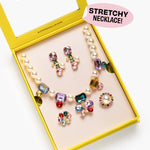 - Set includes one stretchy gem-studded necklace, one pair of clip-on earrings, and two adjustable rings