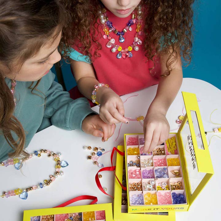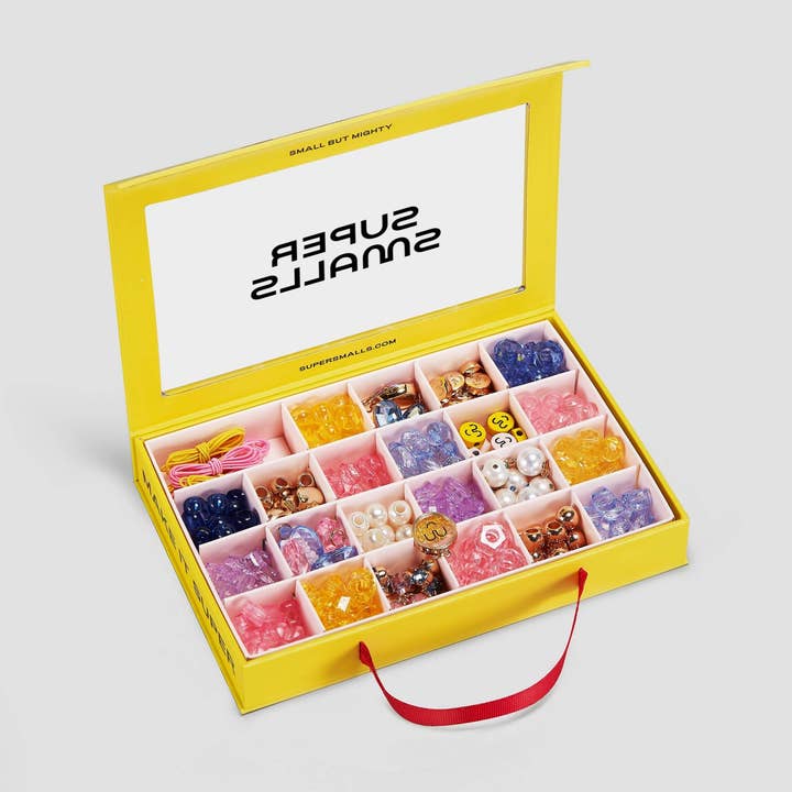 Calling all future jewelry designers (and fans of anything sparkly), this bead kit is for you! Dream up and design your very own jewelry in a combination of colors, beads and pendants for a sparkly, special, Super Smalls look that is all your own. Kit includes beads, pendants and cords, all packaged in our reusable Make It Super yellow box with individual compartments to keep your beads organized.