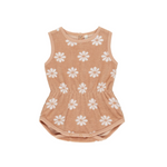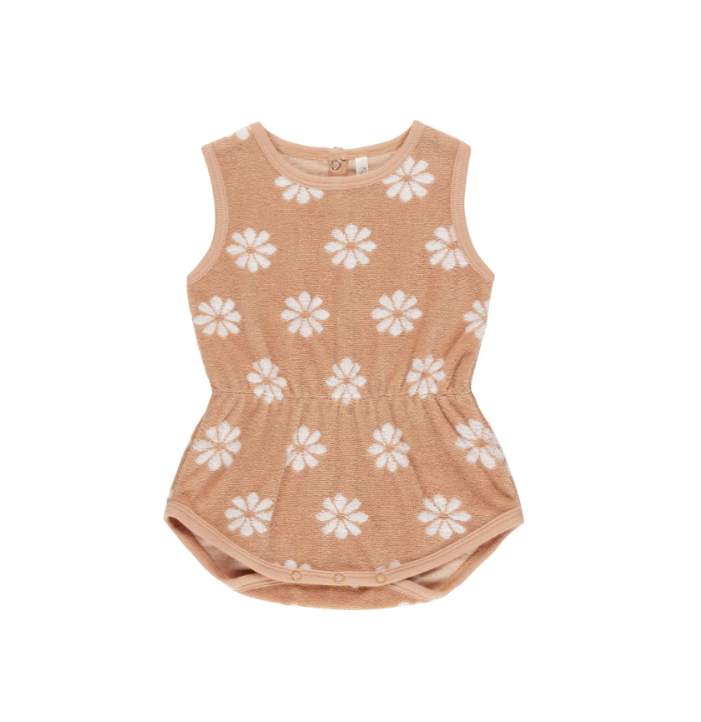 A textured-terry cloth shell motif is fun for little fingers to explore on a cotton-blend romper that's cinched at the waist for a bit of shaping.