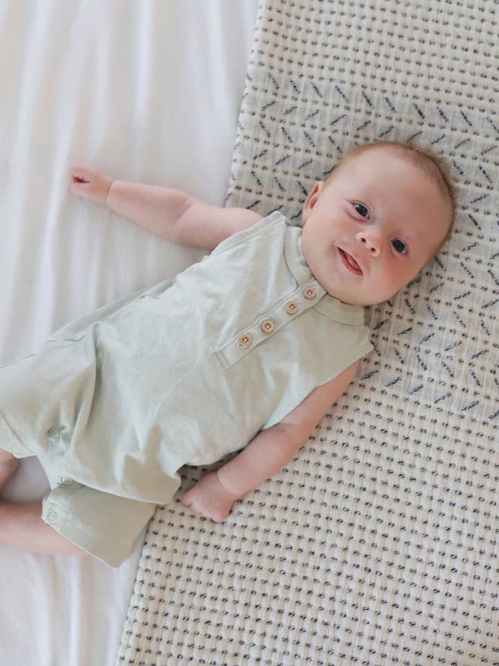 A fresh take on the ultimate summer one piece - the Henley Romper for babies. This lightweight, adorable outfit is as cute as it is functional.