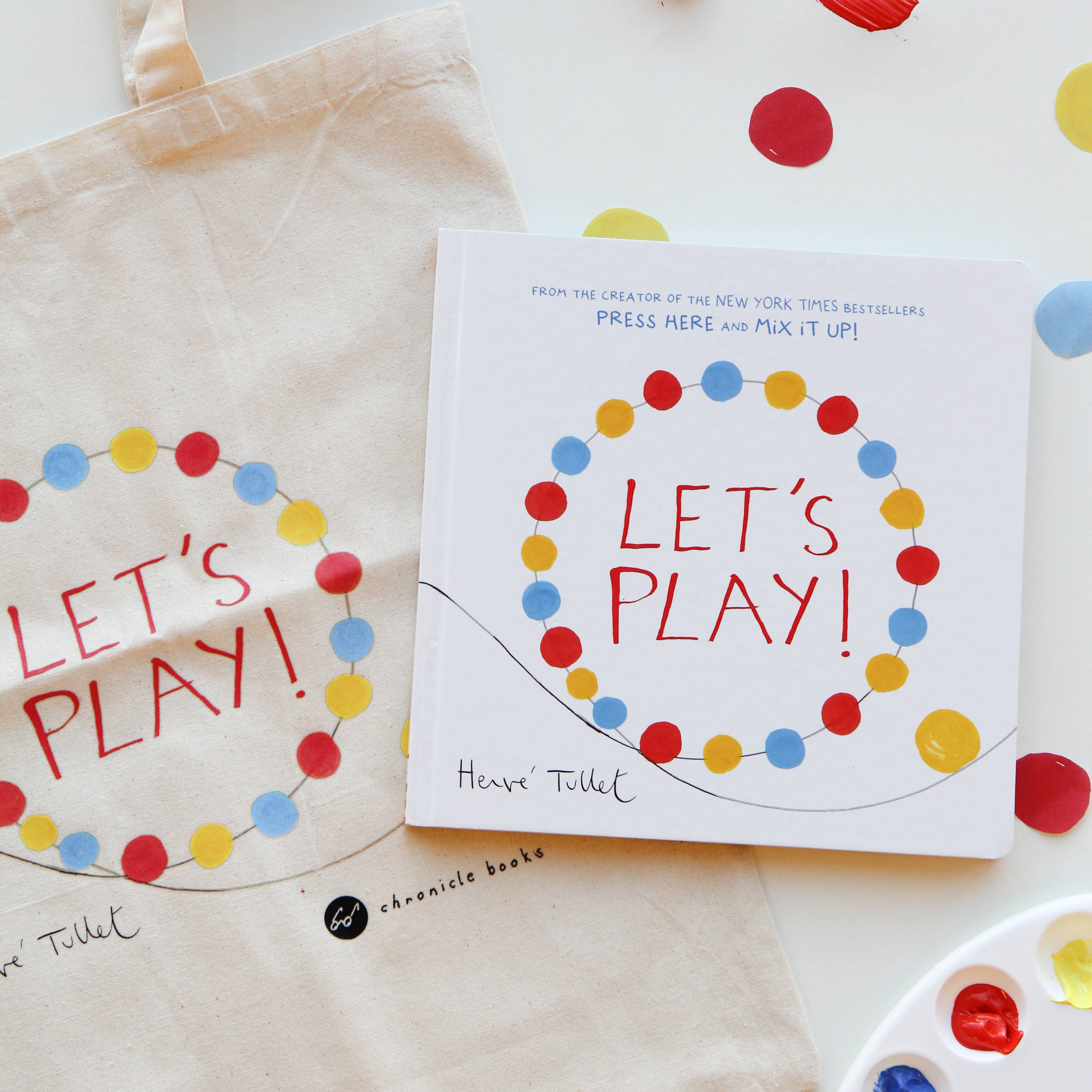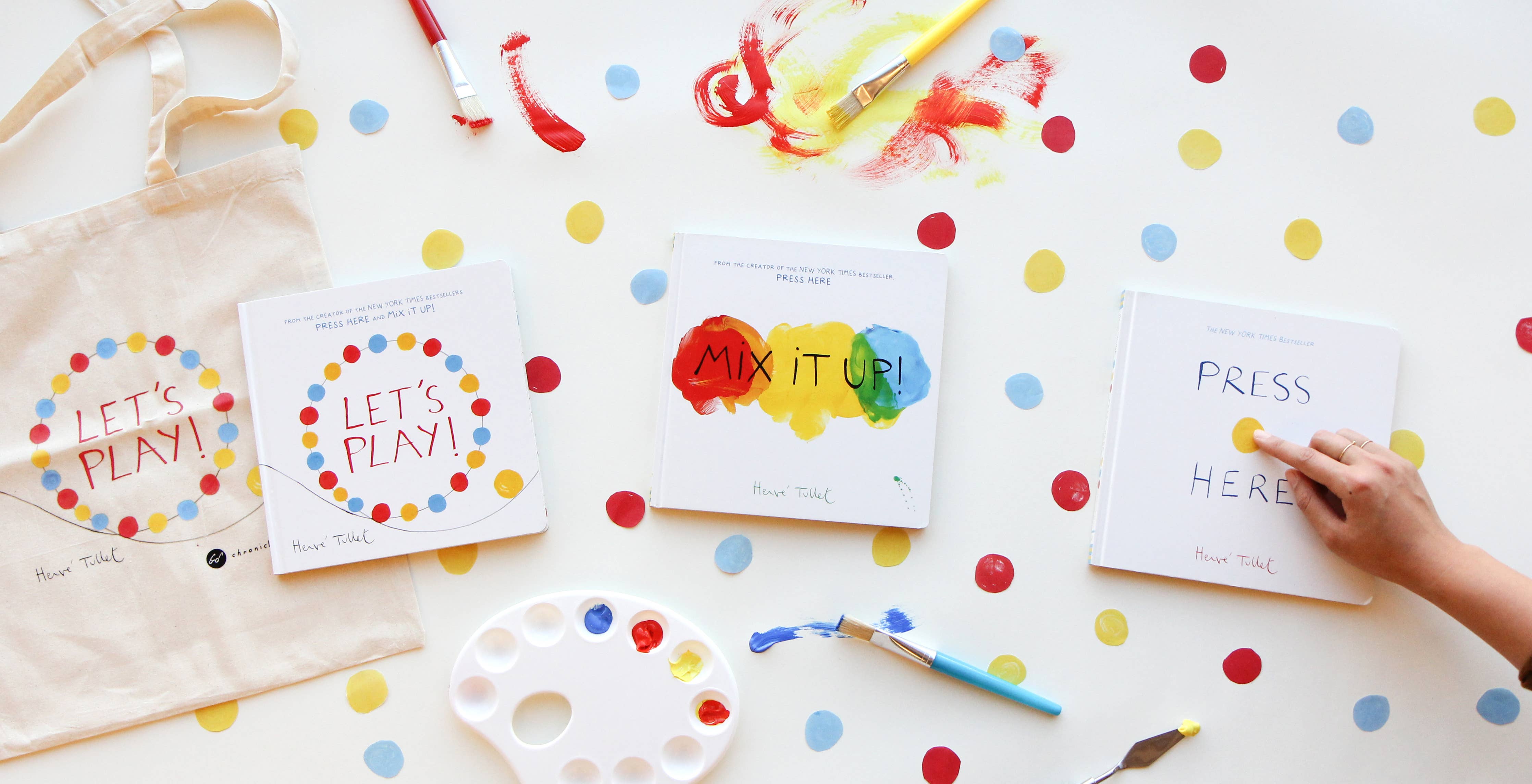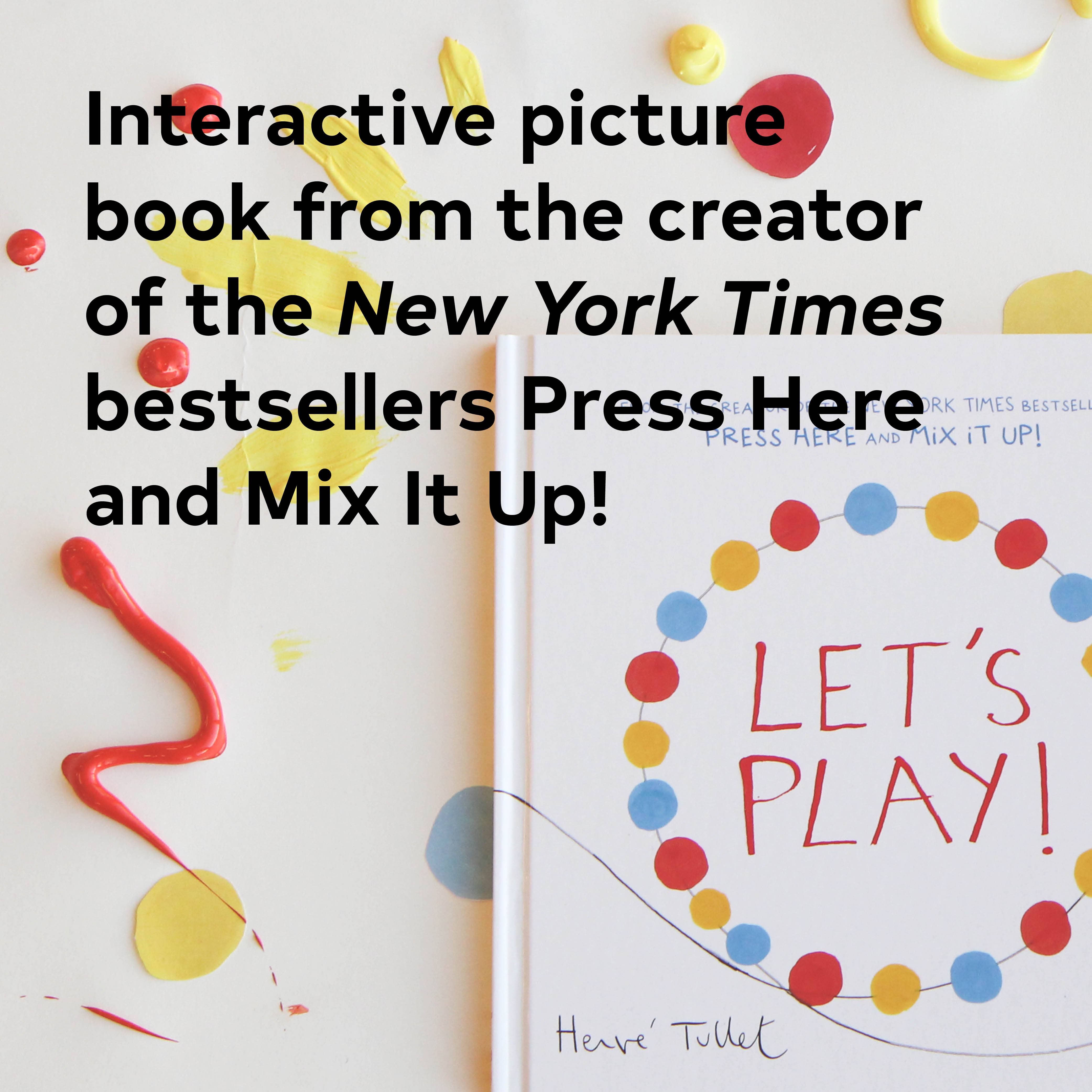 PRESS HERE, MIX IT UP!, LET'S PLAY! and now SAY ZOOP! Collect all four interactive books from Hervé Tullet! It's only a yellow dot...but what a dot it is! Readers won't be able to resist this jaunty, adventurous dot, nor its invitation to play along. Thus begins a spectacular ride of color, motion, shape, and imagination, filled with the artistry and delight that we know and love so well from Press Here and Mix It Up!