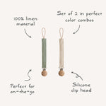 Keep soothing favorites near little hands with our two-pack linen pacifier clip. With an interior water resistant coating, this material can easily withstand daily use and messy moments. Its fabric is soft to the touch while the faux wood silicone clasp holds secure to keep pacifiers in reach and off the floor. The loop design is compatible with most pacifiers as the clip offers durability and long-lasting features to families on-the-go.