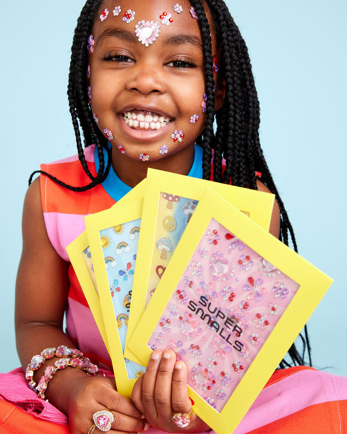 Our Lots of Love Super Sticker Sheet features gem hearts and flowers in pretty pinks and purples. Whether you’re making a card for Mom or decorating your school notebooks, these sparkly stickers will show off your SUPER big heart. Plus, each sheet comes with its own postcard—a place for you to draw new ideas or write your biggest wishes for Super Smalls. Mail it back to us and you just might see your creations come to life!