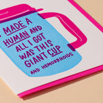 - Card features a hospital water cup and reads: "I made a human and all I got was this giant cup (and hemorrhoids)"