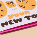 • Card reads, “Congratulations on your new tot" with illustration of two parent potatoes with a tater tot baby”