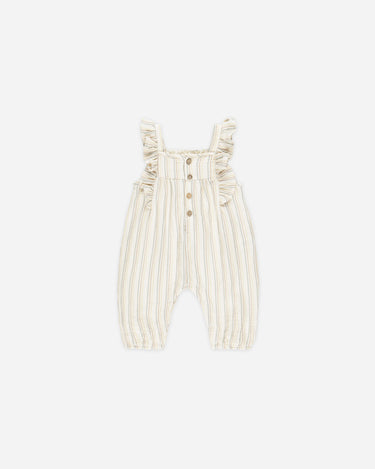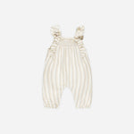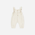 Sweet full length romper with front button placket and ruffle strap detail. Designed with bottom snaps for easy changes.