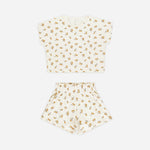 This comfortable set comes with a short sleeve top and coordinating shorts with an elastic waistline.