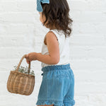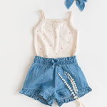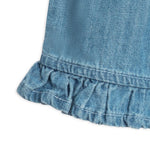 Twirl-ready and oh-so-cute, the Callie Chambray Ruffle Waist Short is made for sunny days filled with fun. Featuring a ruffle waist and sweet front bow, these shorts bring just the right amount of flair to every outfit. The delicate ruffle leg openings and faux back pockets add a touch of playful charm. Crafted from soft organic cotton chambray, the Callie Shorts are a playful addition to your little one's wardrobe—perfect for everything from park adventures to family picnics.