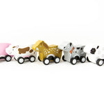 Our Mini Barnyard Rollers are now Pull Back Racers! Plus, all new artwork. These mini barnyard pullbacks are on the move and ready to roam the farm! Pull them back, then let go for a burst of speed! Includes pig, horse, cow, dog, and sheep.