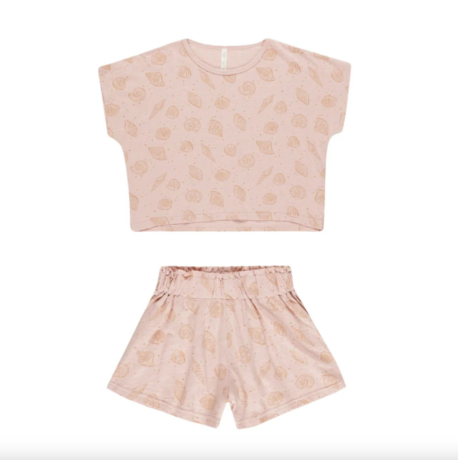 Get ready to shell-abrate in the Rylee + Cru Raegan Set! This matching set features a playful seashell pattern that will make you feel like a true beach babe. The perfect outfit for any sunny day adventure! This comfortable jersey set comes with a short sleeve top and coordinating shorts with an elastic waistline.
