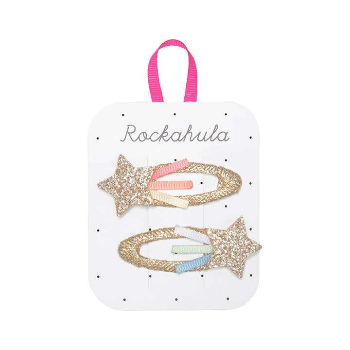 Catch a shooting star and wear it in your hair with our beautiful rainbow star clips - two gold glittery stars each with bright coloured ribbon tails, secured to a gold ribbon wrapped snap clip.
