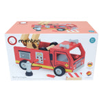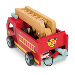 This fire engine has an extendible natural wood ladder, a wind up mechanism for the hose cord, and an emergency barrier. It also comes with a water hydrant and hose to attach to the side of the engine.