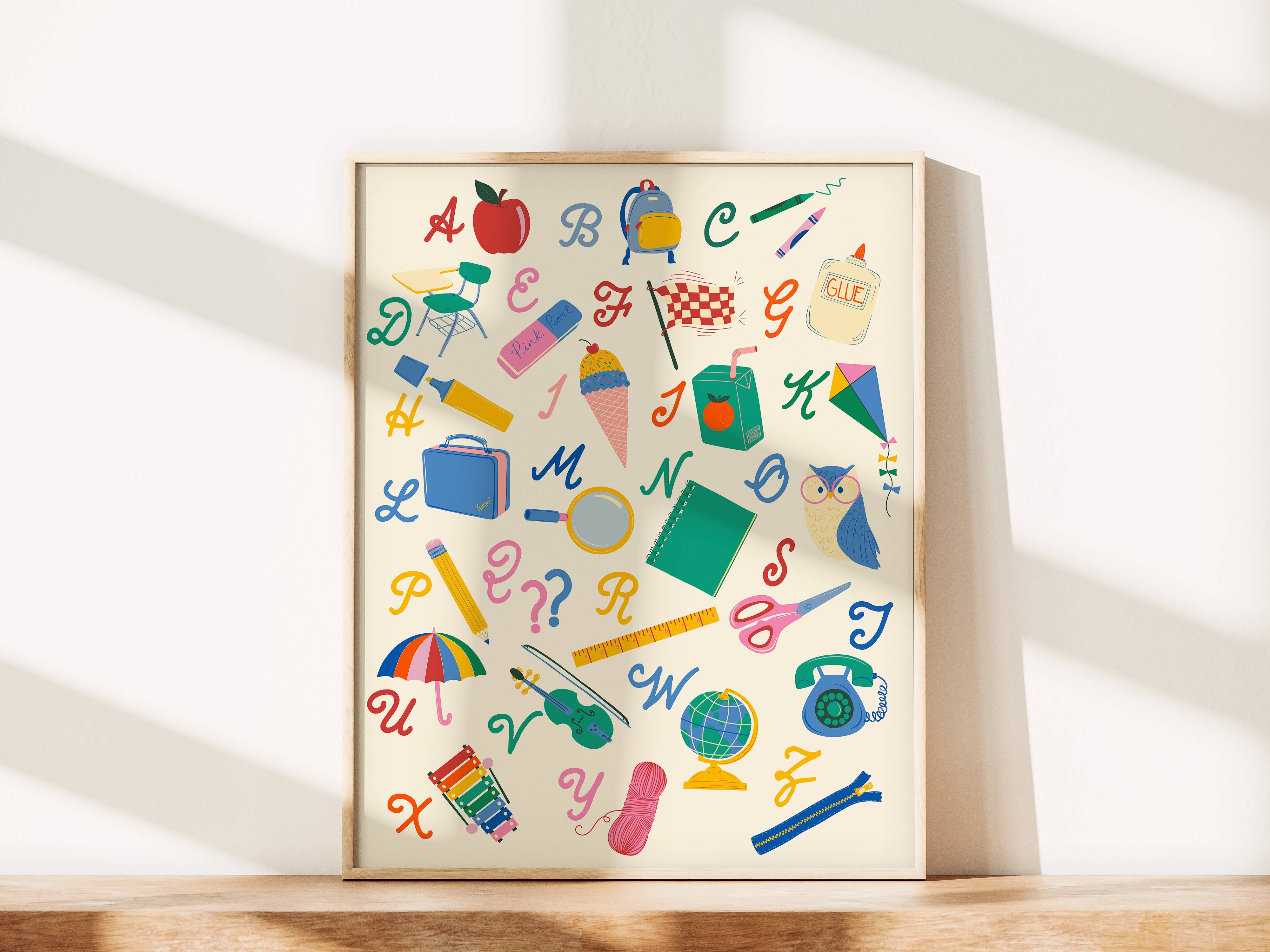 Spruce up any classroom or nursery with our School Supplies Alphabet Wall Art Print! This colorful and whimsical hand-illustrated chart features all the essential items for learning, adding a fun twist to the ABCs. Perfect for sparking excitement in little ones and creating a playful atmosphere for learning. Get your hands on this unique piece today!