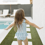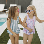 Our Twirl one piece swimsuits are this seasons must have easy wear suit. Designed to fit similar to our Ruffle Rashguard suits, these suits offer an adjustable cross back design with sewn in skirt detail around the middle. As with all of our girl suits, they are fully lined with our ultra soft nylon fabric and are a full coverage bottom. They do have added length similar to our other items to ensure long wear for little ones! These are a very easy on/off design for quick bathroom access.