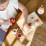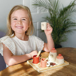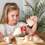 This wooden tea set toy includes a dotty tray, a toy teapot, 2 pretend cups saucers and spoons, a pretend sugar pot with lid, a pretend milk jug and 2 wood biscuits.