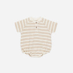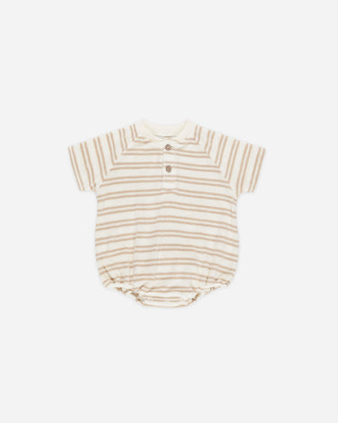 Bubble romper in our comfy terry cloth fabric designed with a front button placket and bottom snaps for easy changes.