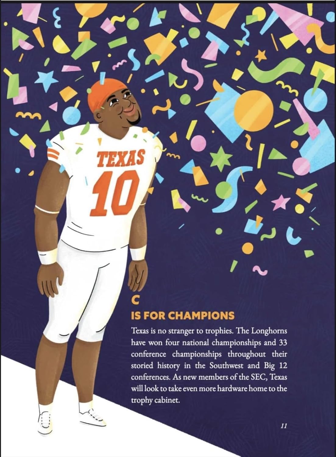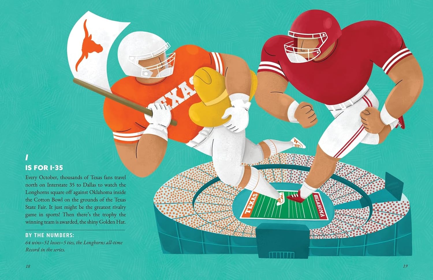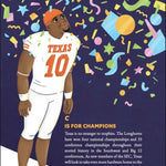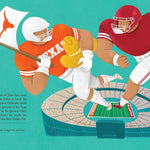 In this informative alphabet book, little Longhorns of all ages will learn about the traditions, legends, and amazing moments that make up Texas Football while learning to love reading. The Longhorn Alphabet functions on one level as an alphabet book for younger children, but the captivating writing and entertaining illustrations also allow older readers to dive deep into the rich history of the University of Texas’ football team. This book lays the groundwork for creating the next generation of passionate fans and helps families build lasting memories around sports together.