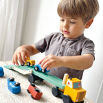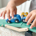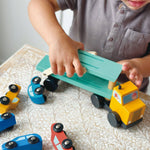 This car transporter vehicle toy has 3 different coloured cars. The top level can be moved to a flat position with a movable arm.