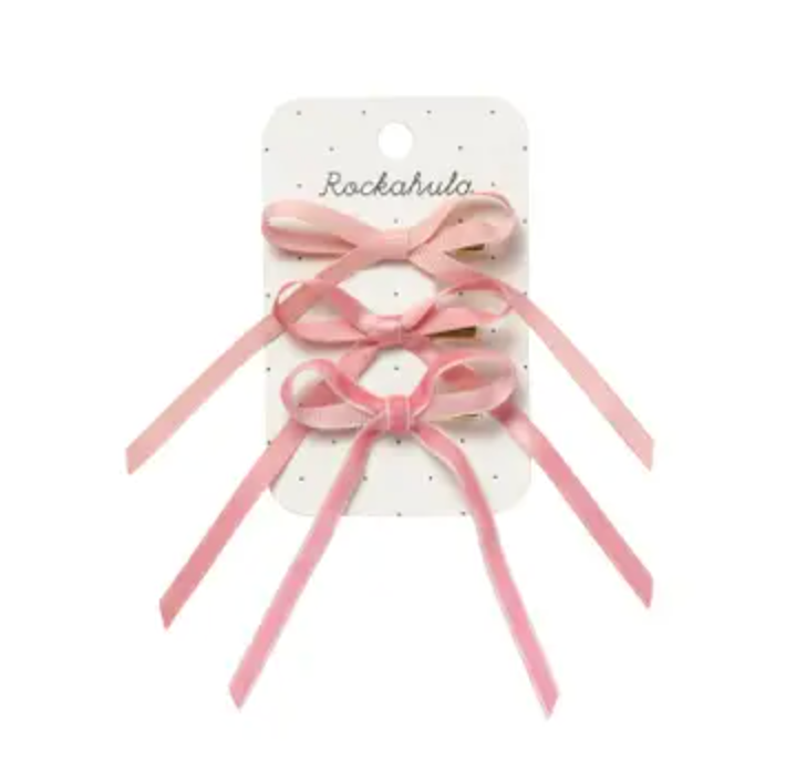Mix and match this adorable pack of three clips for the cutest look! Three little hand tied ribbon bows made in a palette of soft pinks and sat upon gold croc clips! Wear them one at a time or all at once!