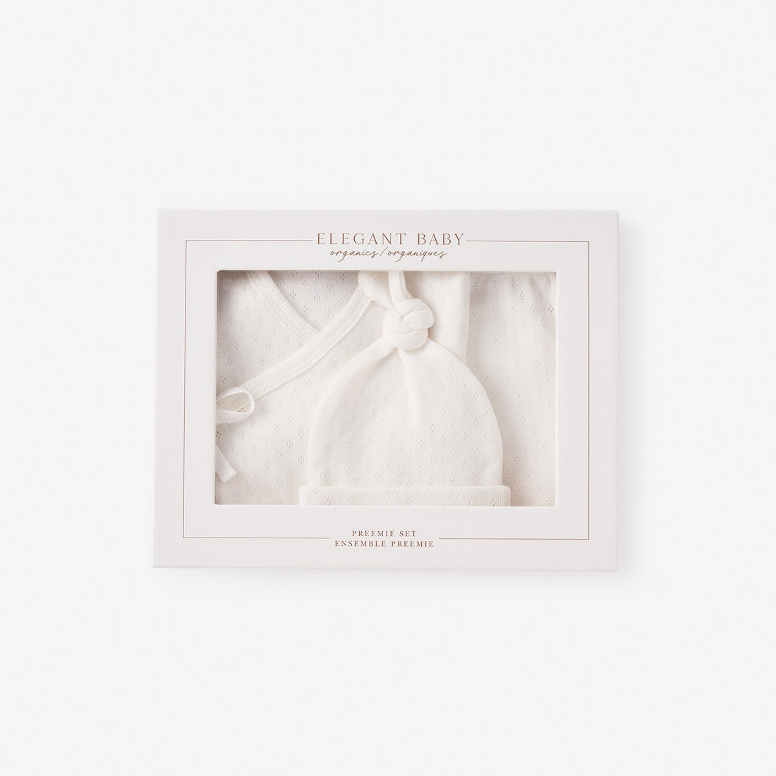 Welcome your little one home in the softest, most natural embrace with our bestselling organic layette set. Thoughtfully designed for baby's first moments, this timeless ensemble includes a kimono tie top, footed pants, a knotted beanie, and a reusable keepsake bag—pure comfort for their earliest days.