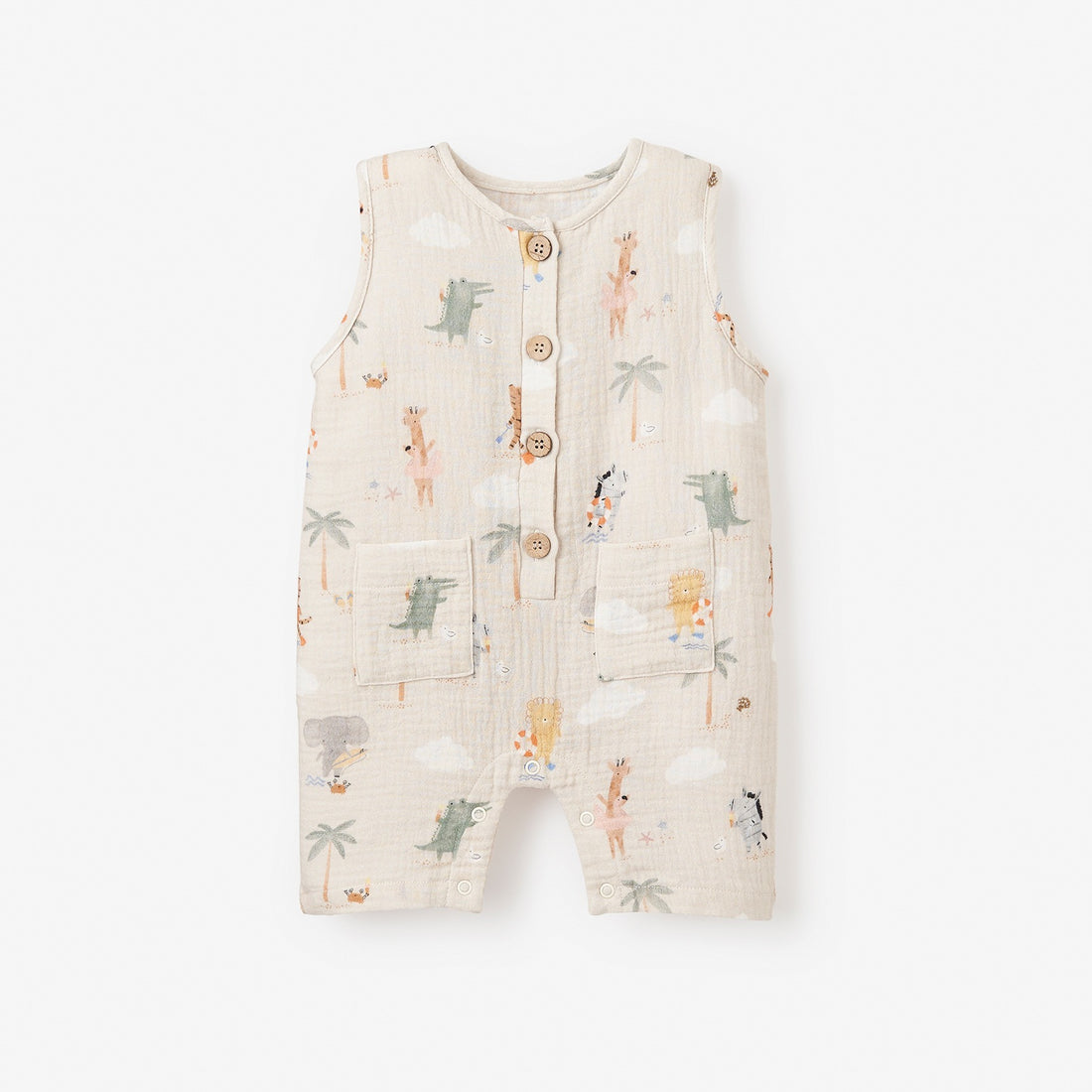 Good for baby, good for the environment. Our organic, naturally sustainable muslin is soft and breathable, ideal for outdoor adventures during the spring and summertime. Cast in a dreamy palette, this muslin shortall baby romper combines fashion and function for the modern child. Wooden buttons and a henley collar add an extra dash of style to this already stunning organic baby romper.