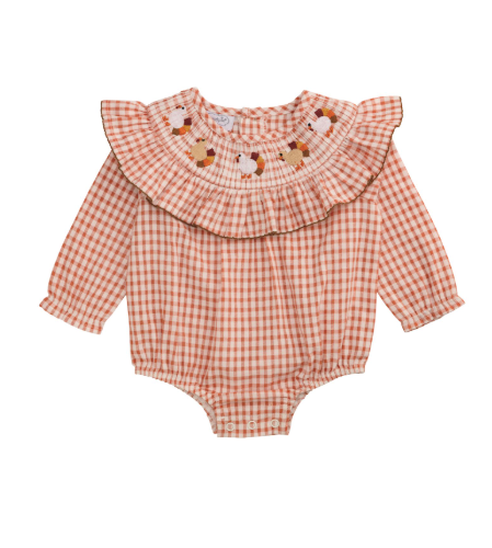 Get your little one ready for a festive feast with this adorable Smocked Turkey Bubble Onesie. Soft and comfy, it’s perfect for cozy family gatherings and capturing those precious holiday moments. Dress your sweetest little turkey in style this Thanksgiving!