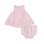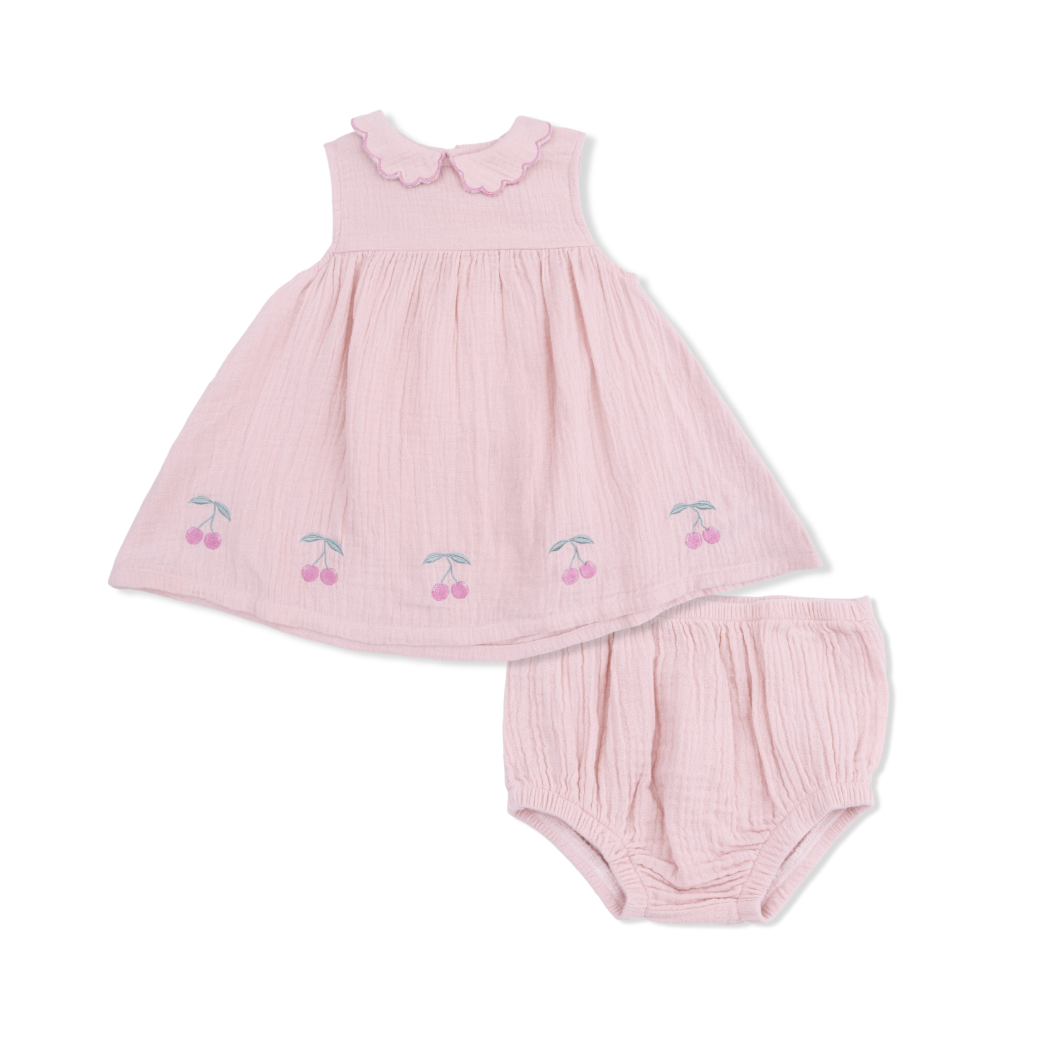 Our Petal Collar Dress Set, made from soft, breathable Organic Cotton Muslin, is brimming with charm. The delicate embroidered edge on the petal collar and tiny cherry embroidery along the hem add whimsical, playful details that make this dress perfect for family gatherings, photos, or everyday adventures.