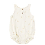 Sleeveless bubble onesie with front button placket and bottom snaps for easy changes.