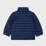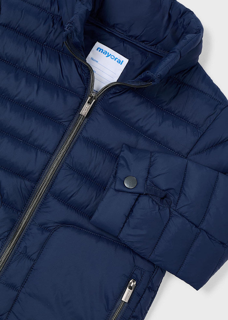 Contains recycled polyester. Long sleeved Puffer jacket for boys. Wraparound collar. Hidden hood. Front, central zip fastening. Textile exterior with quilted effect. Pockets with zips.