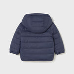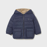 Padding of garment 100% recycled polyester. Long sleeved Puffer jacket for baby. Hooded collar. Front, central zip fastening. Textile exterior with quilted effect. Soft polyester inner lining. Elasticated hem, cuffs and collar for a better fit. This is a reversible item.
