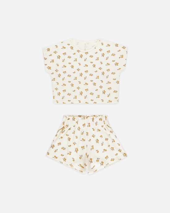 This comfortable set comes with a short sleeve top and coordinating shorts with an elastic waistline.