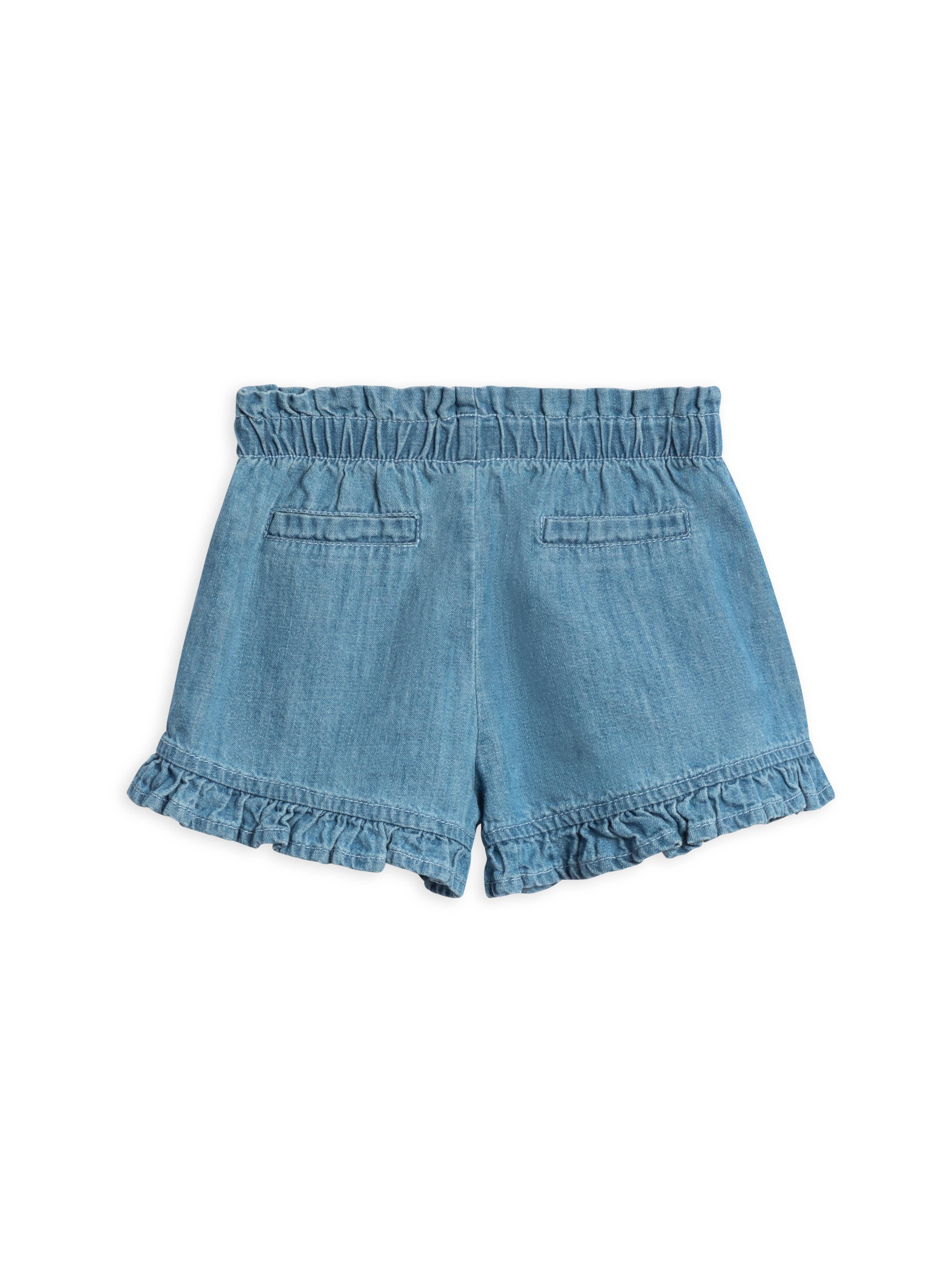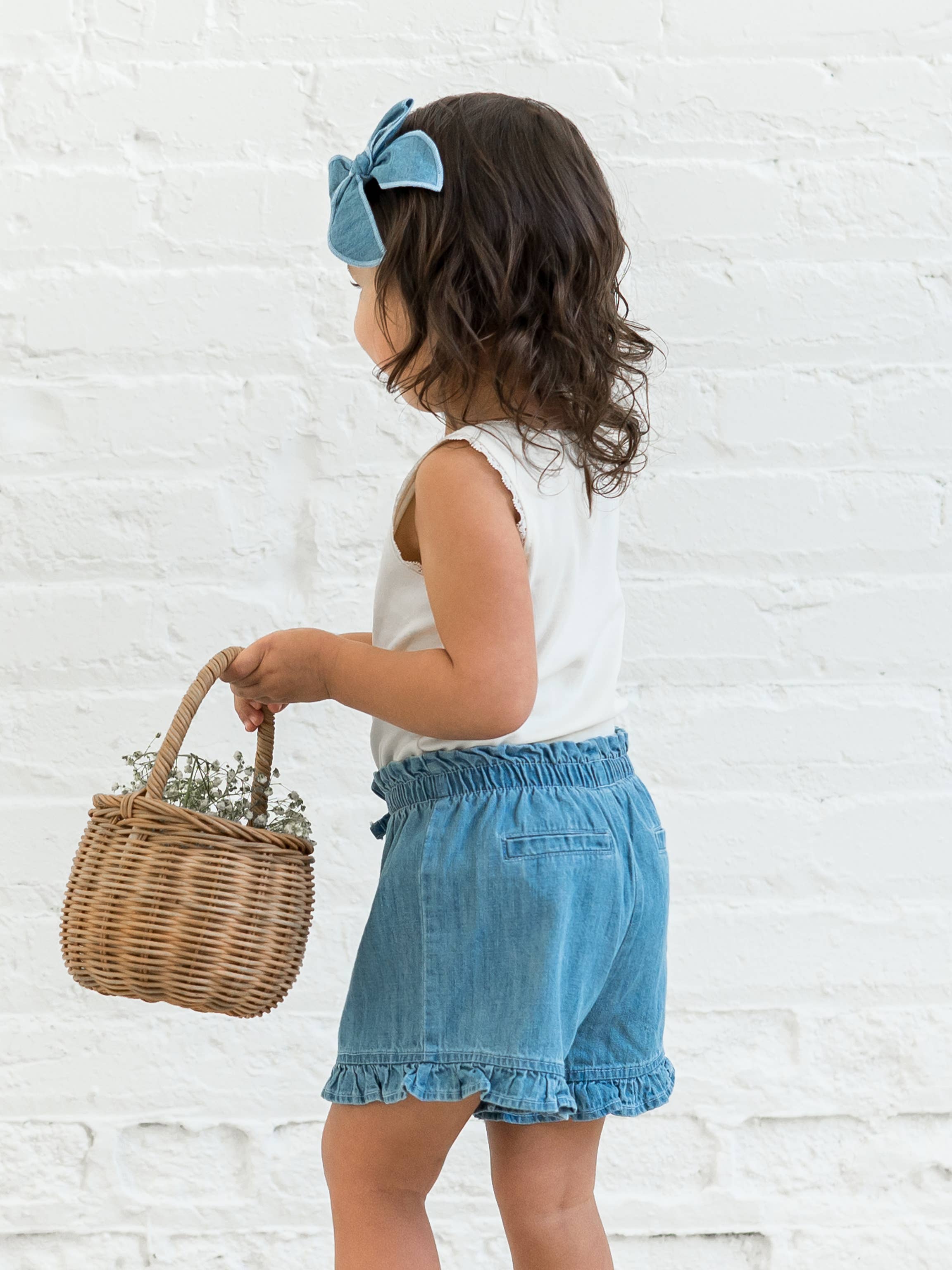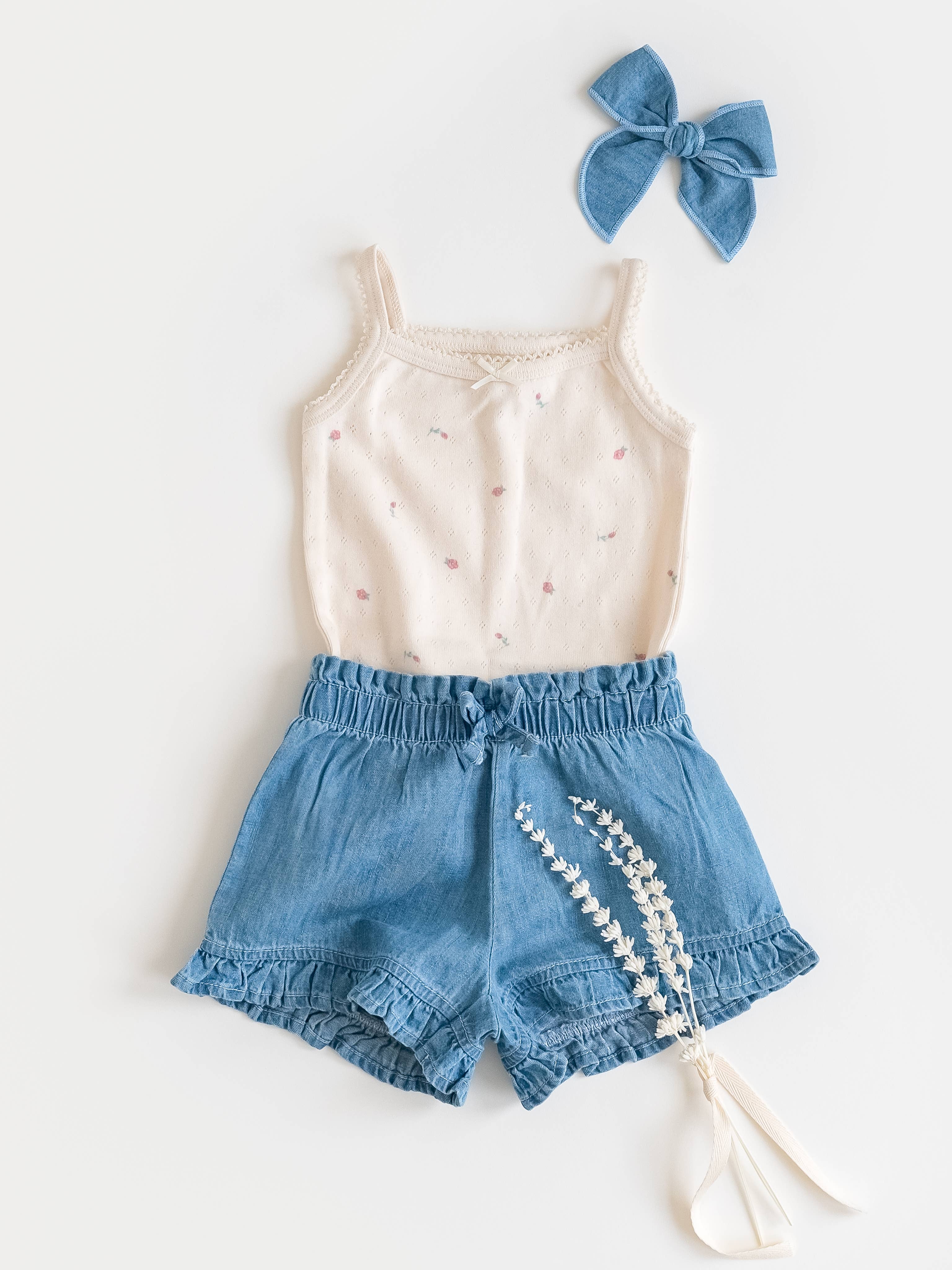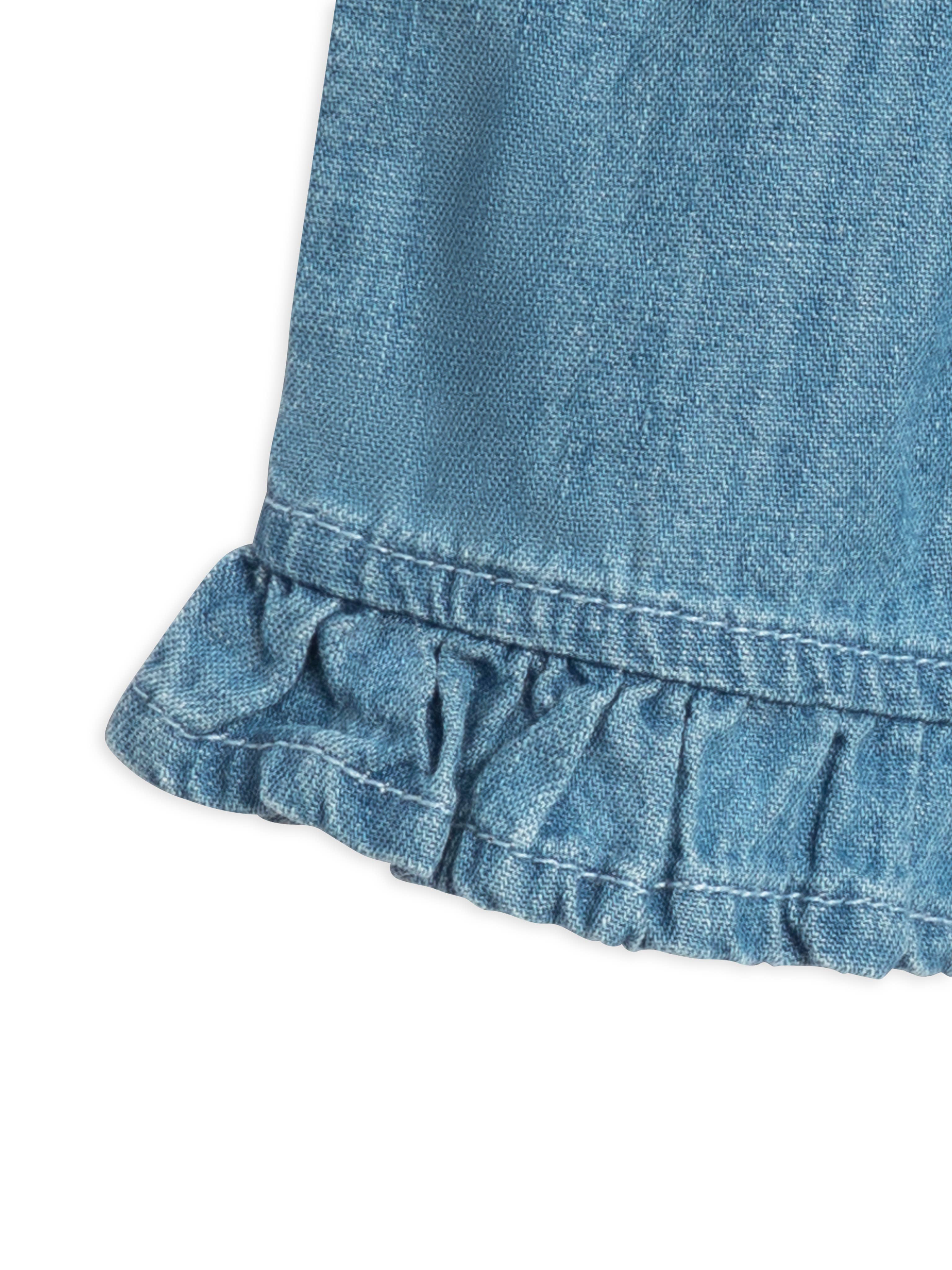 Twirl-ready and oh-so-cute, the Callie Chambray Ruffle Waist Short is made for sunny days filled with fun. Featuring a ruffle waist and sweet front bow, these shorts bring just the right amount of flair to every outfit. The delicate ruffle leg openings and faux back pockets add a touch of playful charm. Crafted from soft organic cotton chambray, the Callie Shorts are a playful addition to your little one's wardrobe—perfect for everything from park adventures to family picnics.
