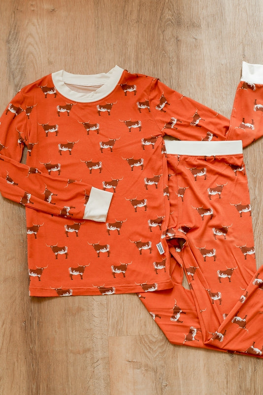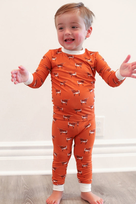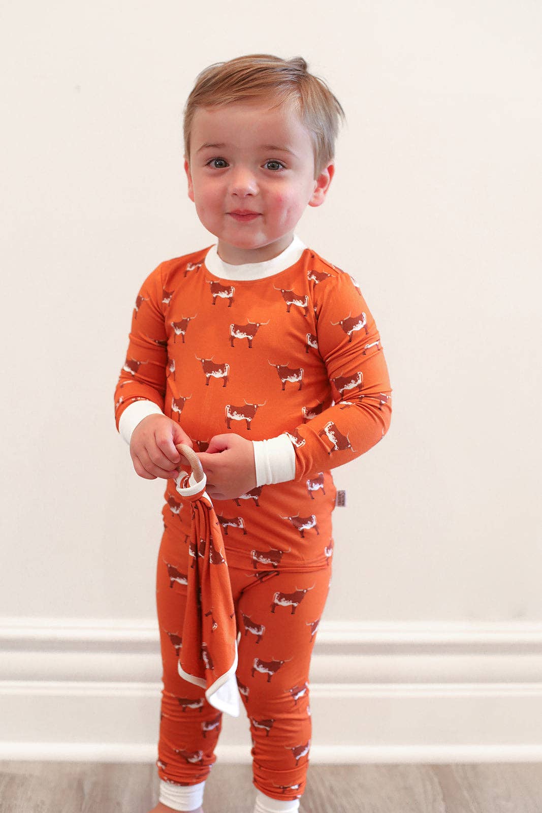 GO TEAM! Our 2 piece pajama sets are made of the softest material - viscose from bamboo! So gentle on skin and perfect for any season, which is great because these sleepers last much longer than your average pajamas due to bamboos amazing stretch abilities. Our Longhorn pattern was created to be a neutral classic design that's sure to become a bedtime staple for your little!