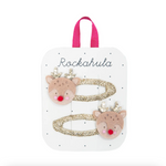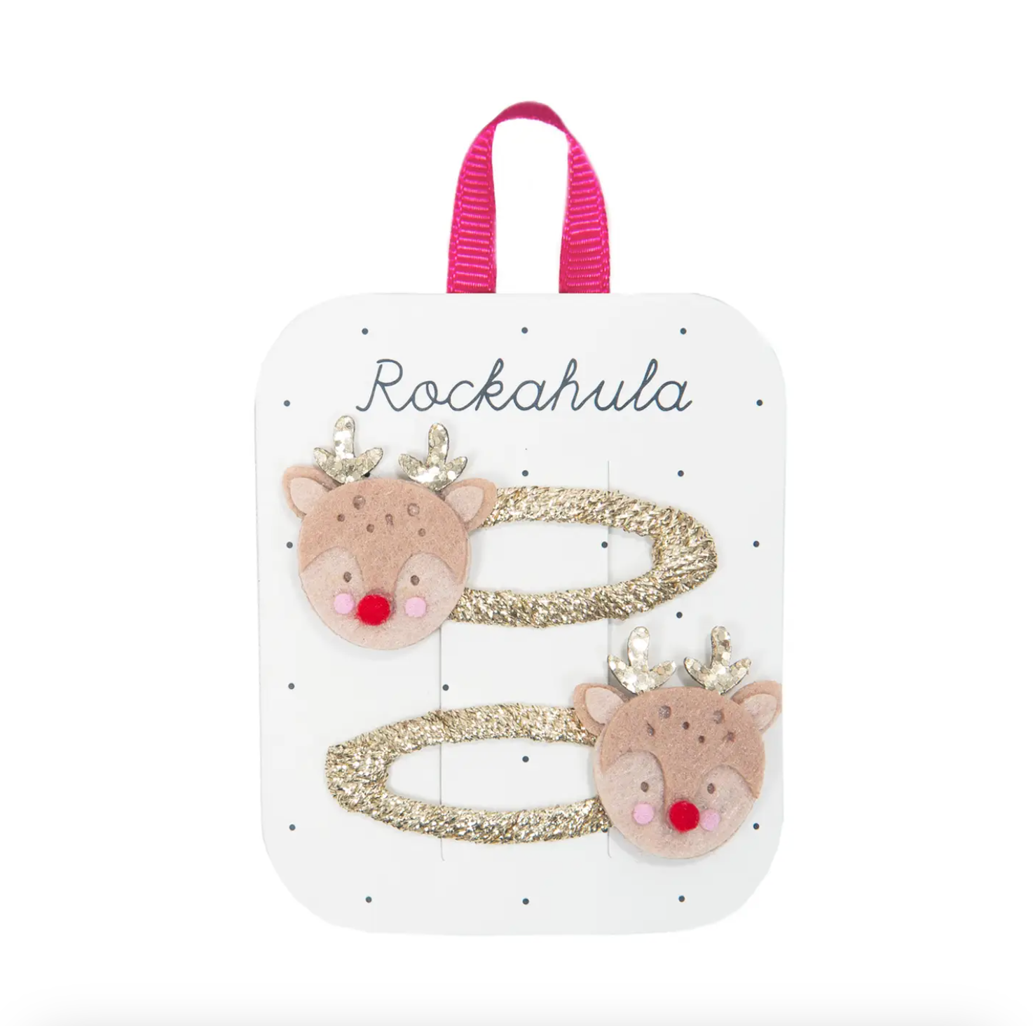 Our gorgeous little reindeer clips are the cutest addition to any Christmas outfit! With glittery gold antlers, the brightest red pom pom nose and secured to a gold ribbon wrapped snap clip. These clips make the perfect Christmas party accessory!