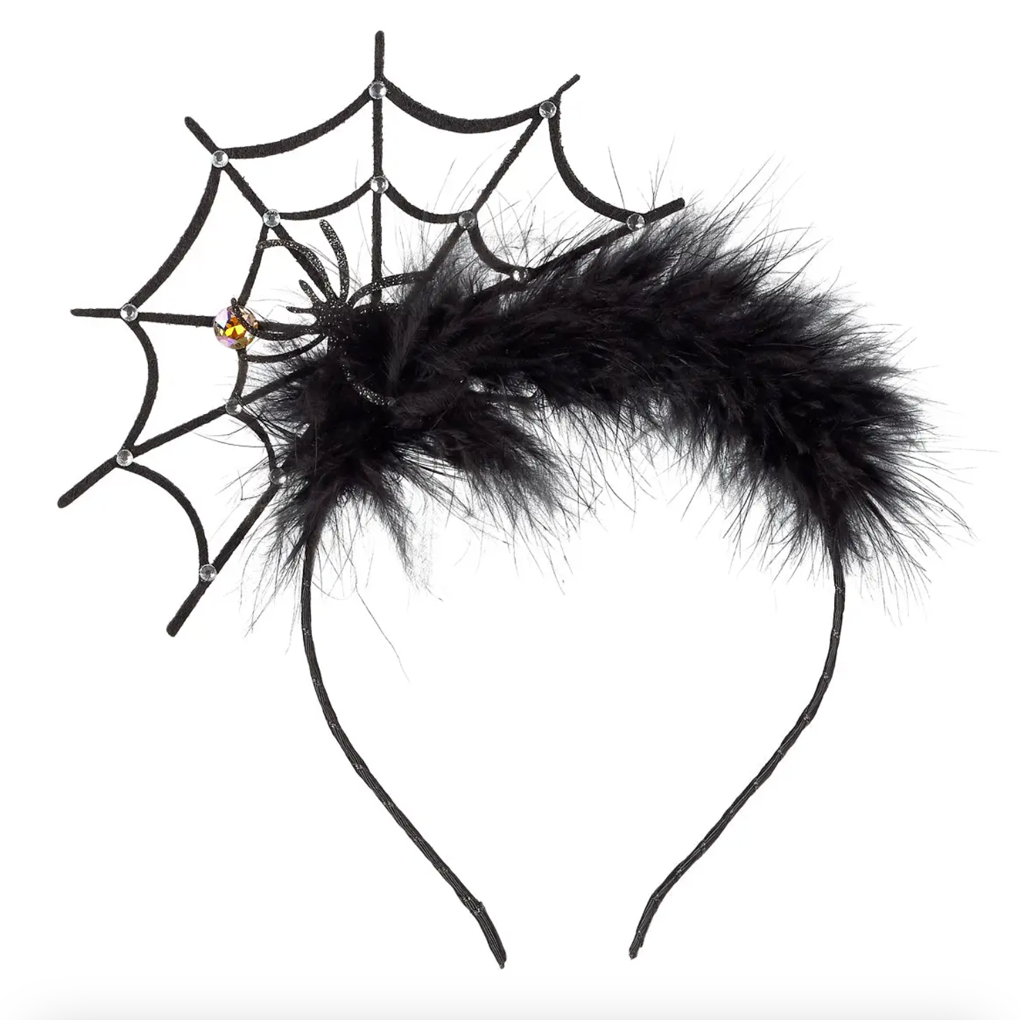 Featuring a bold spider-web design resting on soft, fluffy black feathers, it strikes the ideal eerie yet elegant balance. Tiny gemstone details shimmer to catch the light—and a few admiring looks! Secured on a strong metal band wrapped in plush polyester, it offers cozy comfort for all your little one’s magical escapades.