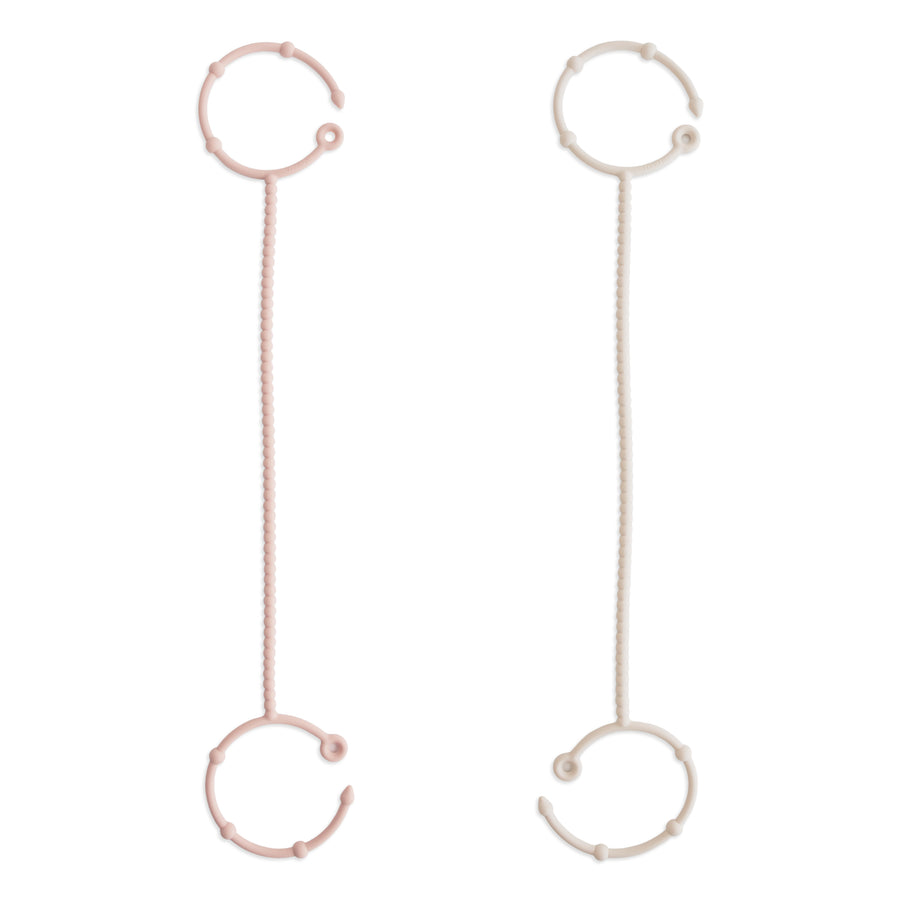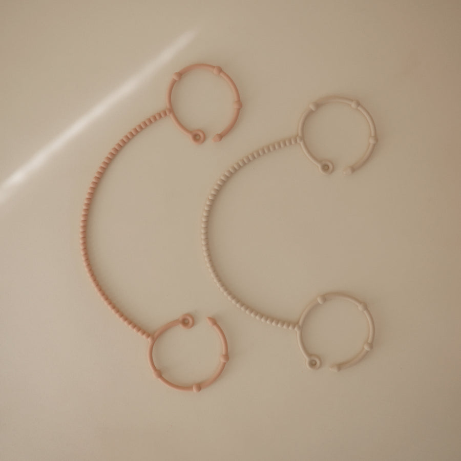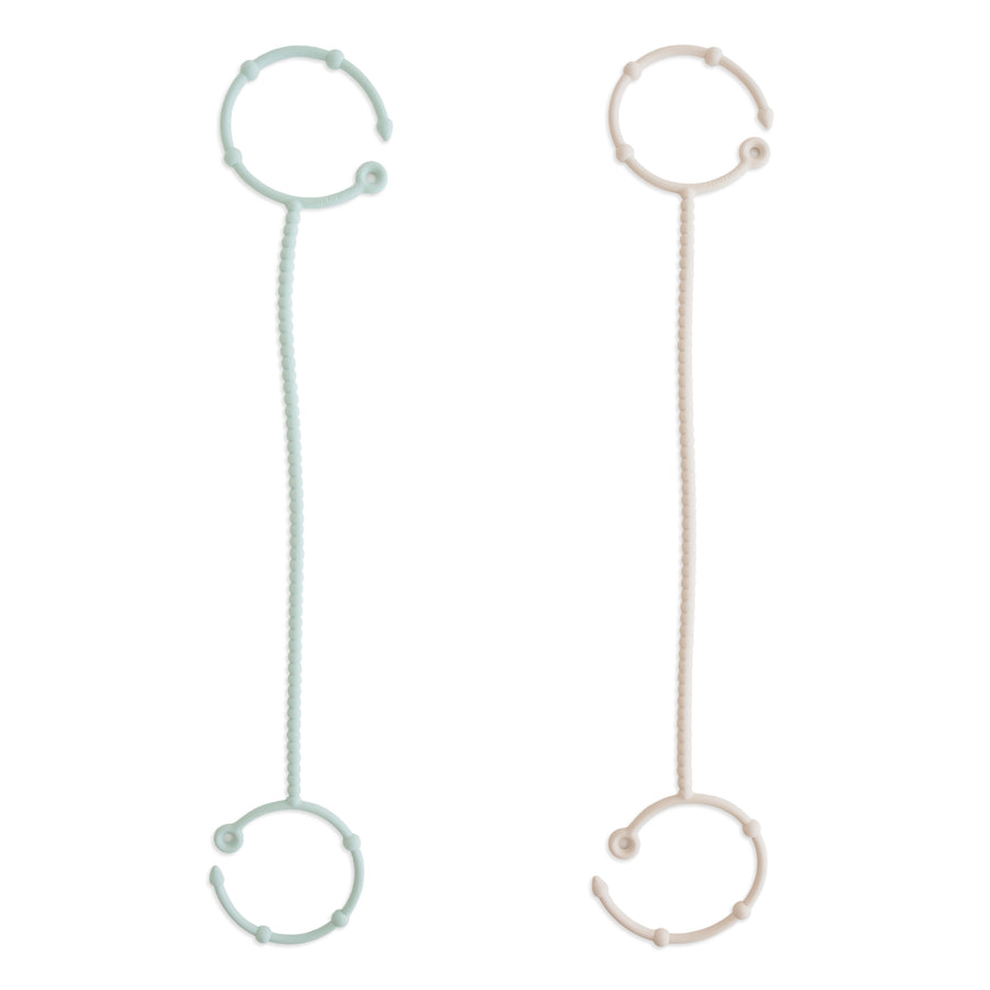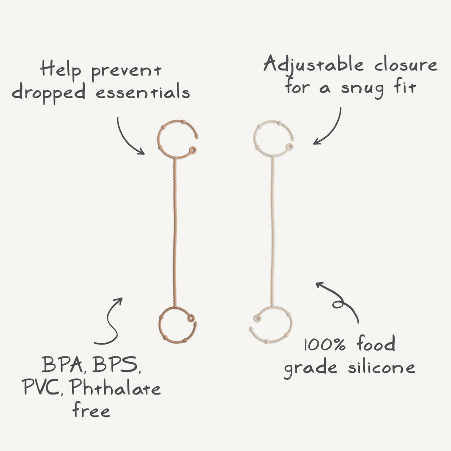 Mushie's adjustable silicone straps keep baby essentials secure so parents and littles on-the-go can enjoy more peaceful outings. Help prevent dropped toys, pacifiers, and sippy cups with these versatile straps designed to attach to strollers, high chairs, car seats, and more. An adjustable closure on each end ensures a snug fit for various items, while the durable non-toxic silicone material withstands daily wear and tear.