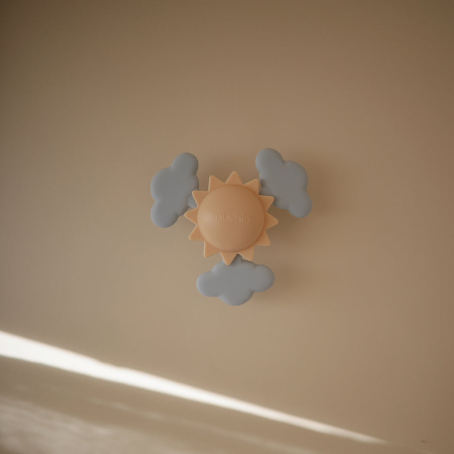 Featuring a playful design and soothing colors, our sunshine suction spinner toy will captivate your little one’s imagination. Littles can spin the 100% food-grade silicone clouds around the sun to create a delightful visual and soothing sensory experience. The sturdy suction ensures the spinner stays in place, preventing accidental drops and encouraging independent play. Keep baby’s attention at home or on-the-go by suctioning to highchairs, cabinet doors, airplane trays, or the bathtub.