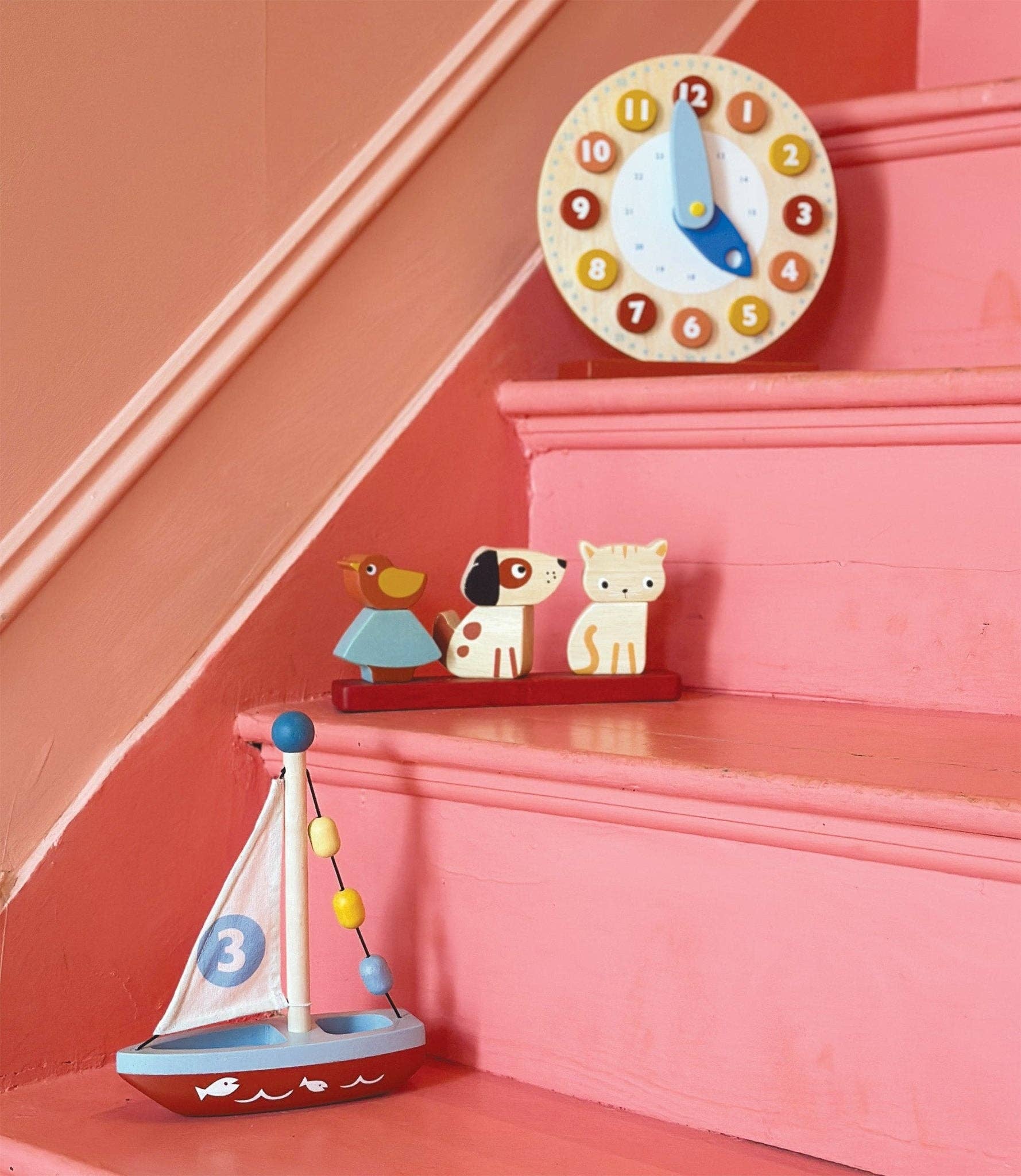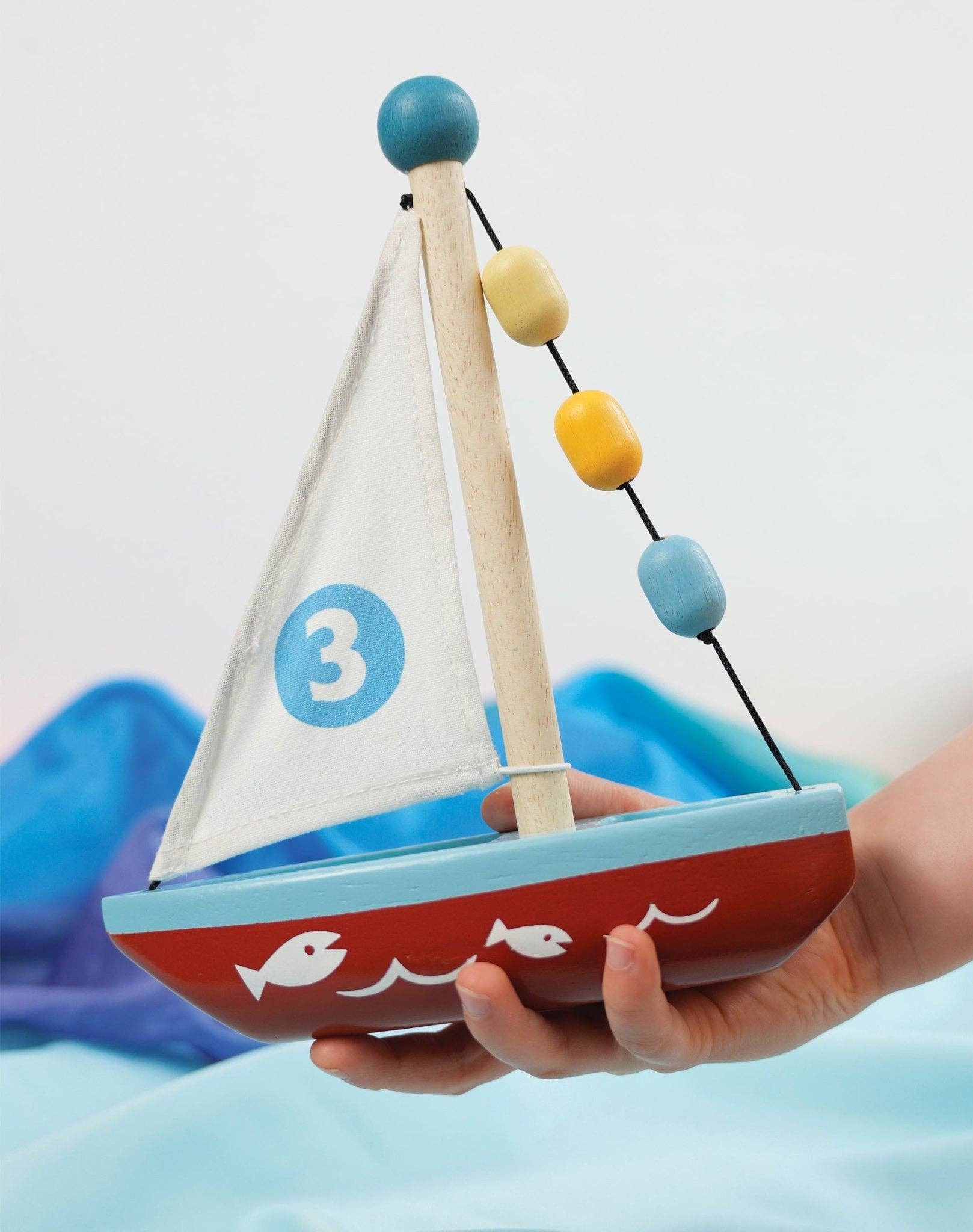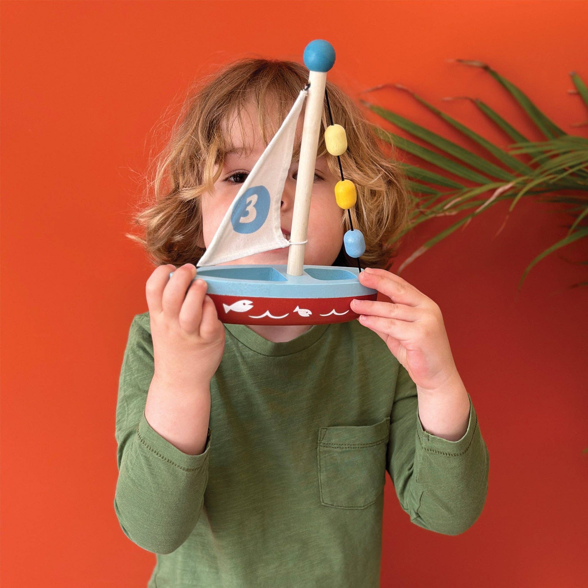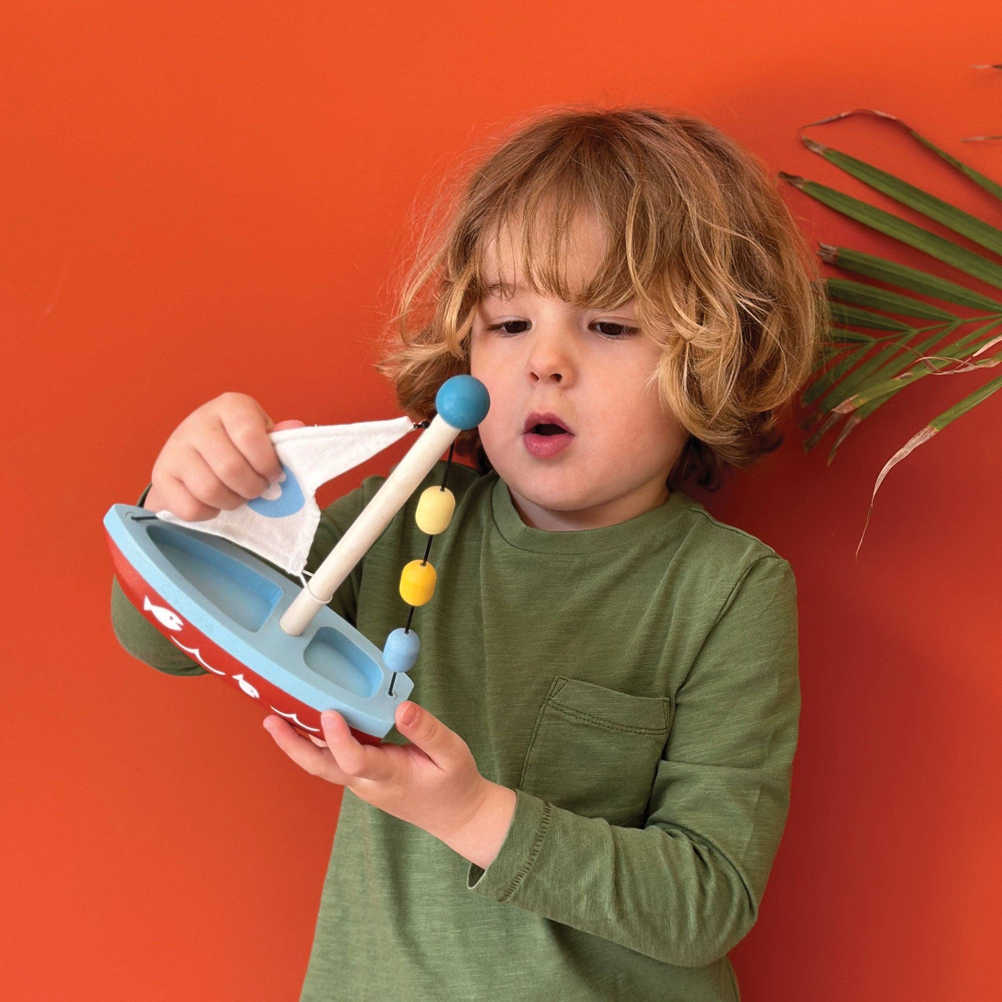 A simple wooden toy boat with printed fabric sail, mast, and 3 decorative coloured beads. Great for open-ended playtime or adding to a set. The boat cannot be put in water.