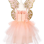 The Annemarie Fairy Costume – Peach Dress and Wings Set invites little dreamers to step into a world of magic and wonder. This charming outfit boasts soft pastel tulle layers, sparkling glitter accents, and a comfy, shimmering bodice that twinkles with every twirl. The highlight? Detachable fairy wings adorned with pink and gold glitter and delicate tulle topped with golden pompoms, perfect for enchanting playtimes.