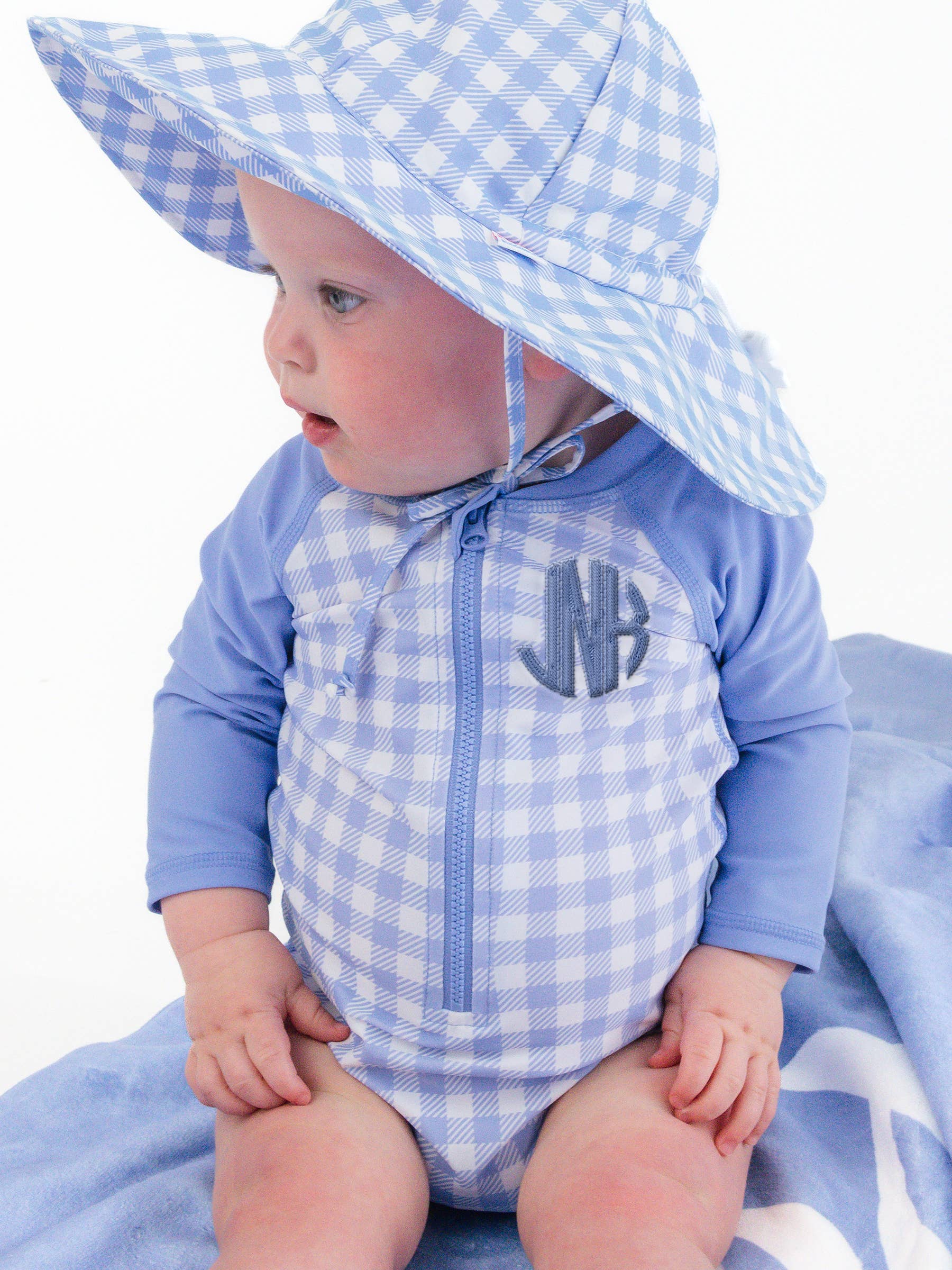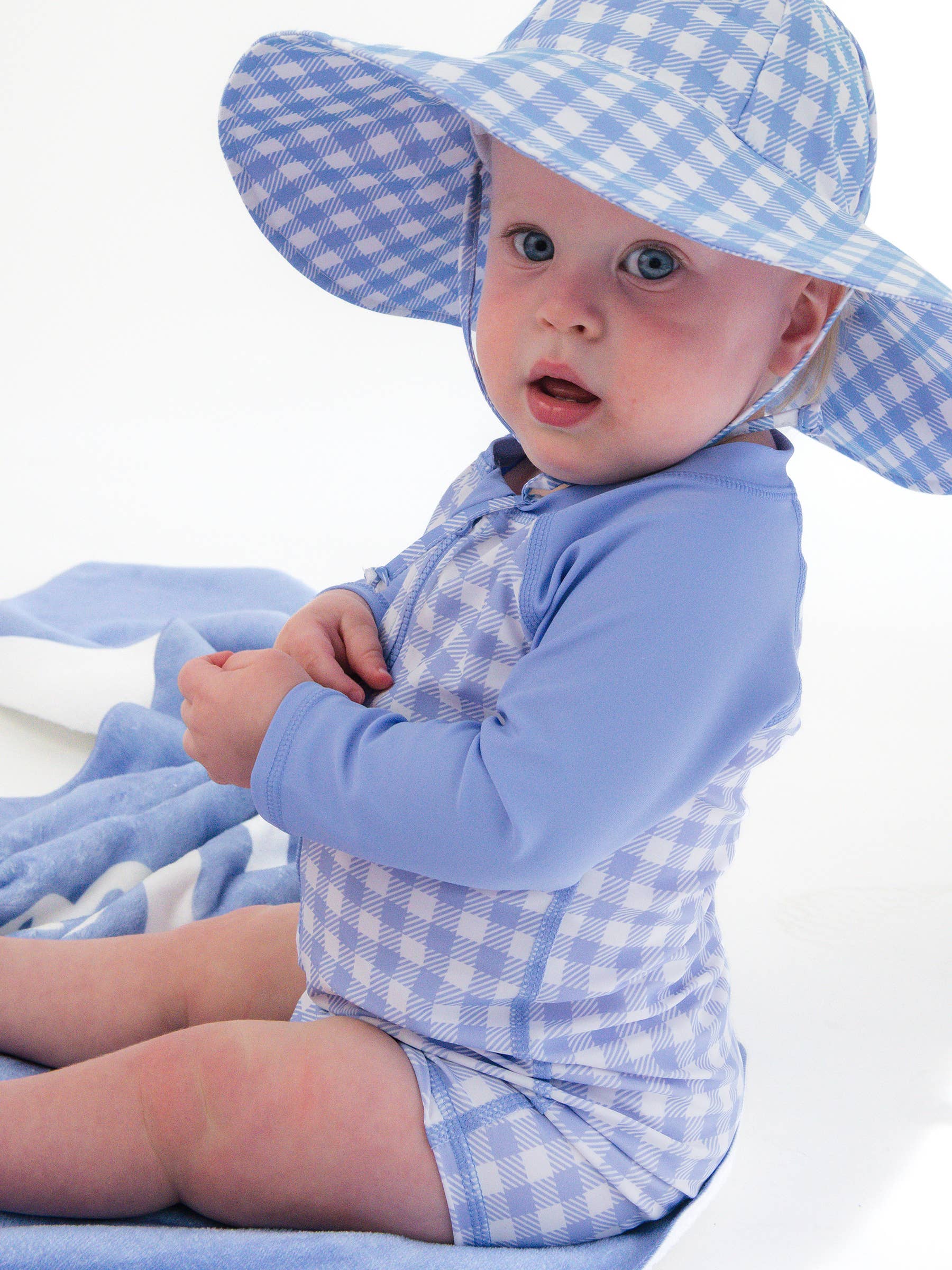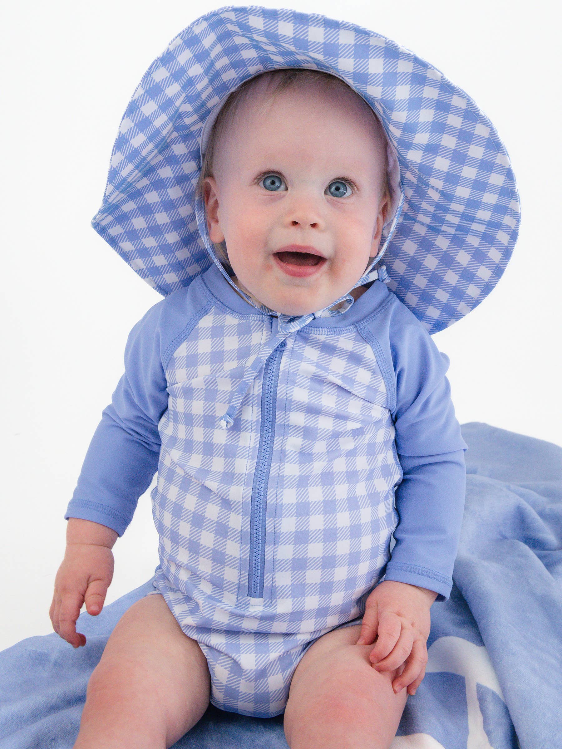 Gingham One Piece Rash Guard Swimsuit - Periwinkle Blue