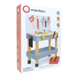 This wooden workshop and tool box includes a toy saw, hammer, a wrench, a screwdriver, a turning spinner to resemble a saw, a tool tray, a small chalkboard, 6 small planks of wood with holes, 3 washers, 4 bolts, 4 nuts, and 4 nails.