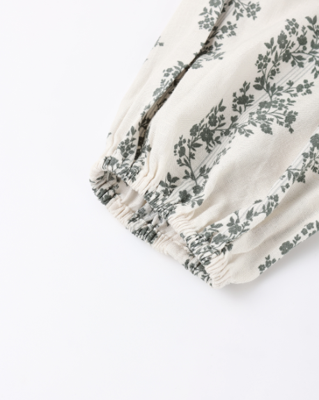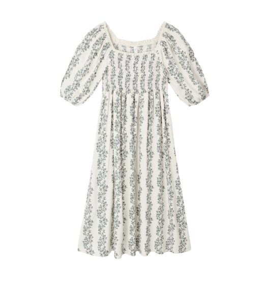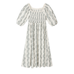 Our Della Dress has a smocked bodice and mid length sleeves, with intricate crochet trim along the front and back neck..