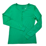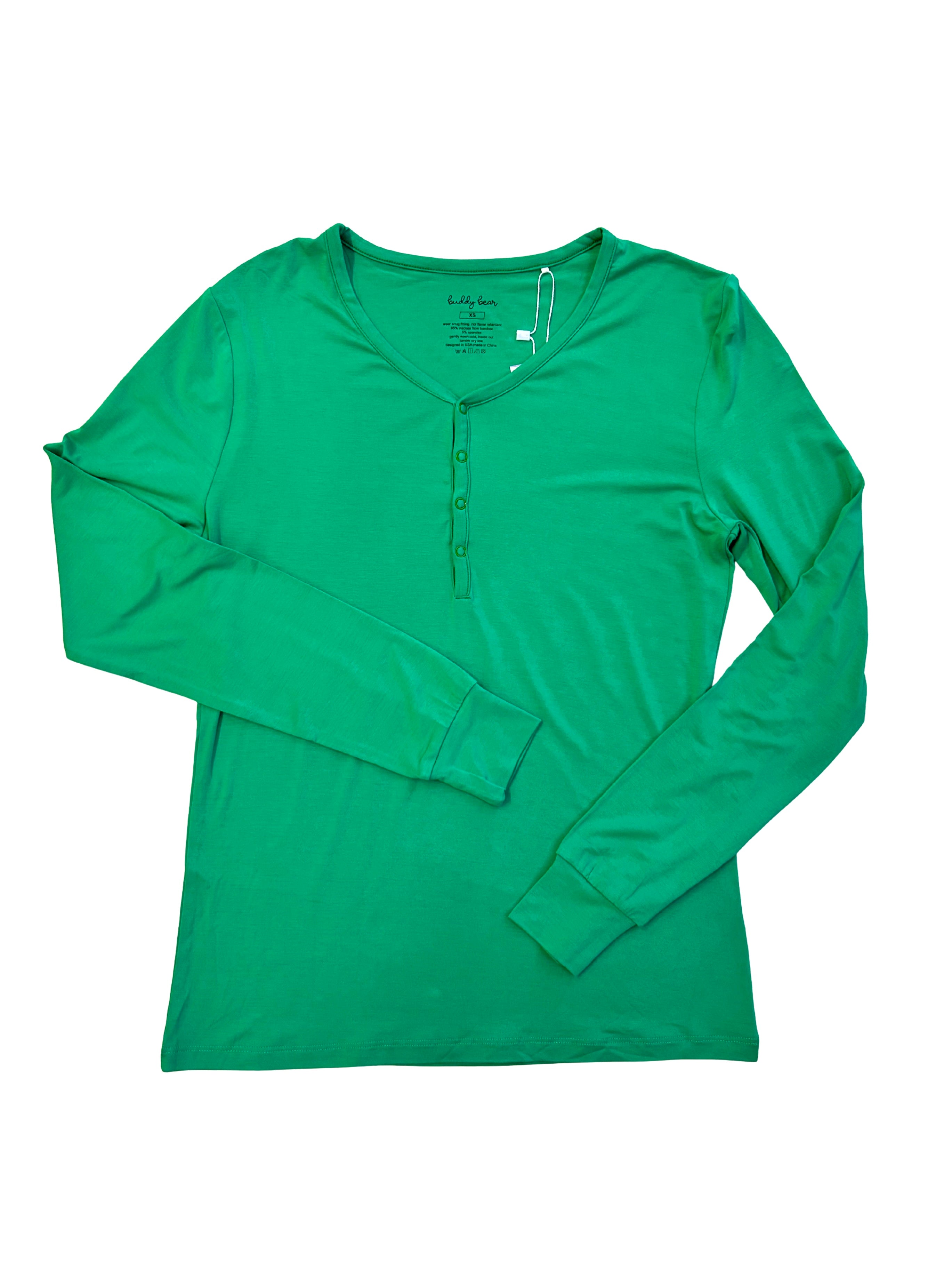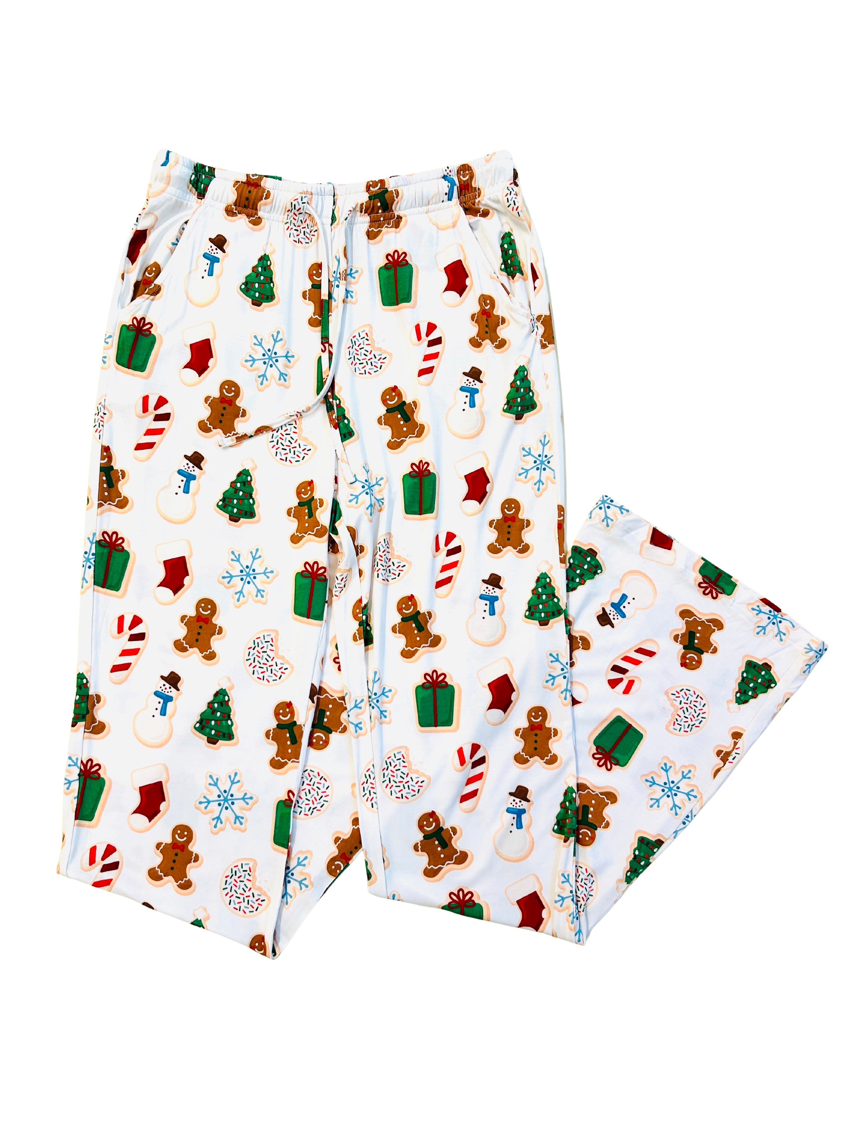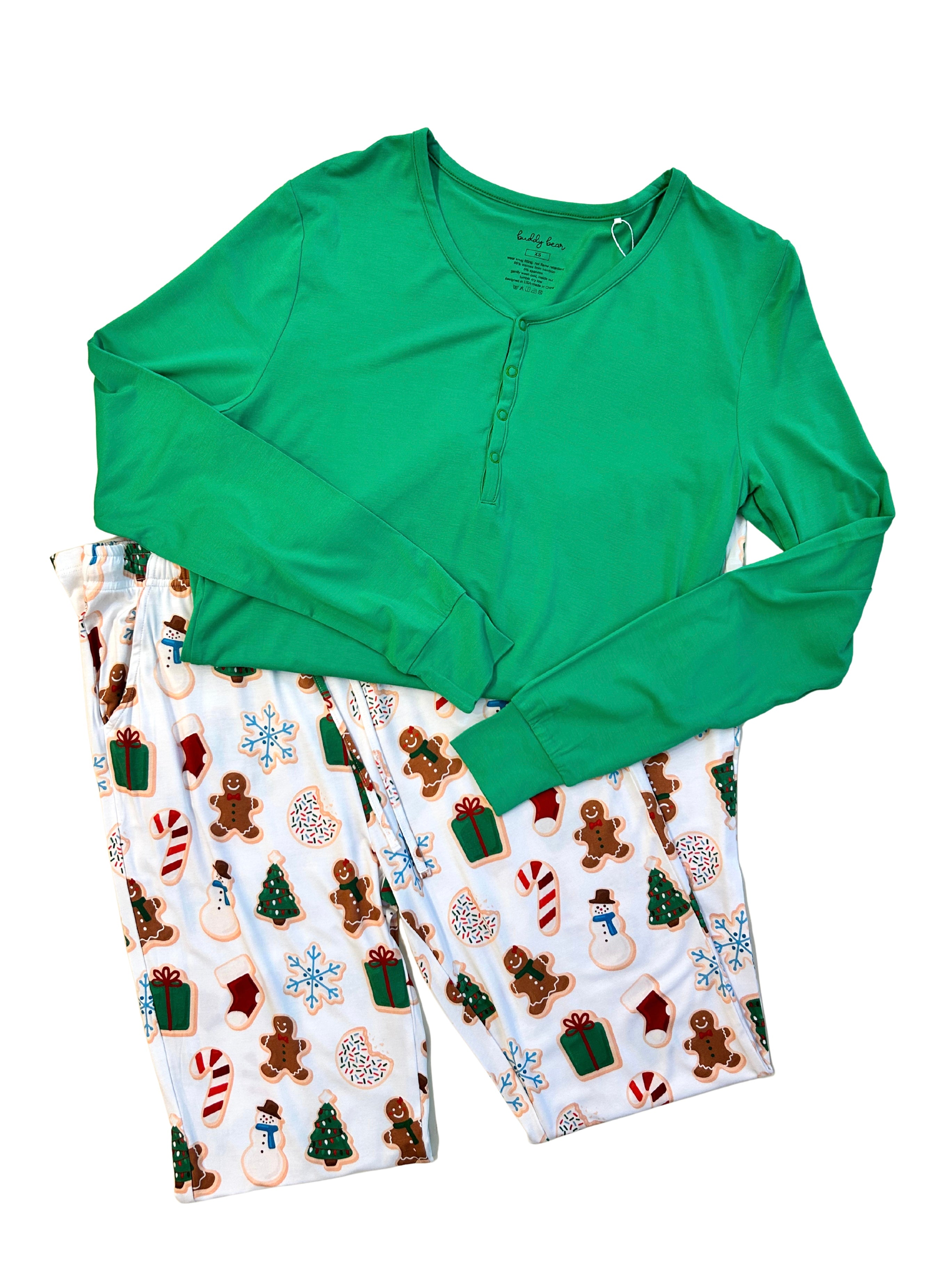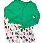 Get cozy this season in our Holiday Cookie Adult Pajama Set! This playful two-piece features a soft green henley top with snap button closure paired with patterned drawstring pants to match the kids' version. Perfect for coordinating holiday family PJs.