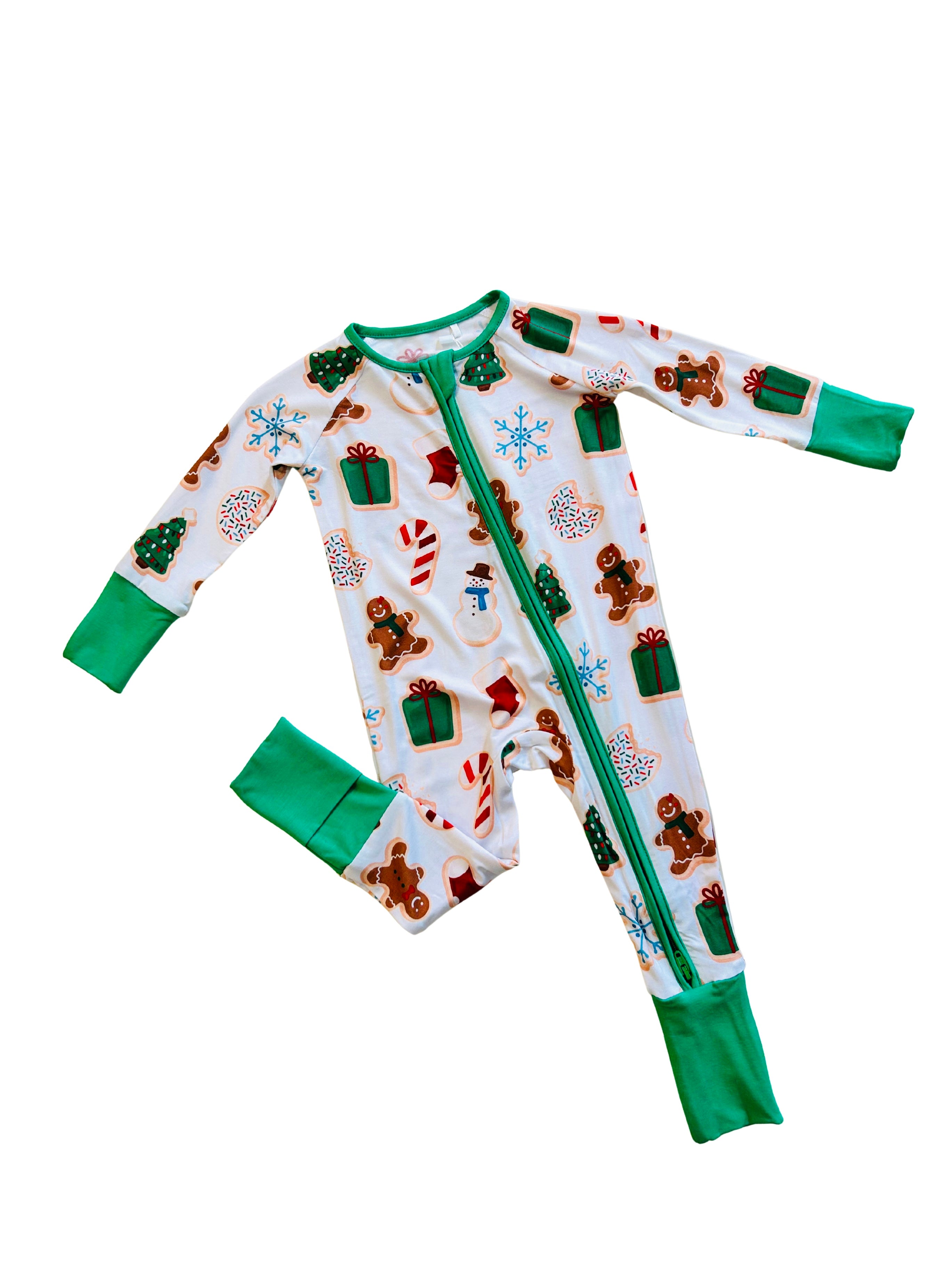 Get ready for cozy holiday cuddles in this adorable Holiday Cookie Zipper Romper! Featuring a festive design perfect for family photo ops, this soft zipper pajama makes bedtime fun for your little one. Available in newborn through 12-18M sizes, it's designed to pair seamlessly with matching family holiday PJ sets for those picture-perfect moments. Easy-to-use zippers make diaper changes and bedtime routines a breeze, while the playful cookie-themed print spreads holiday cheer from nursery to living room.