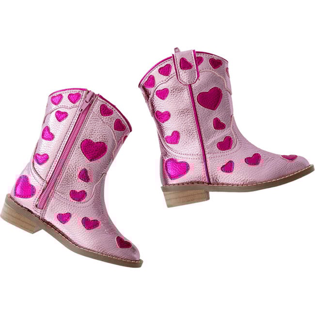 These metallic heart hoots are a dreamy mix of sparkle and western charm. Crafted from genuine metallic leather these boots feature hand stitched hearts hand piped detailing and a classic cowboy boot toe for that signature Wild and Rae flair. Built for all day comfort with a cushioned insole arch support and soft flexible rubber outsole they’re perfect for twirling stomping and exploring in style. A full side zipper makes slipping them on a breeze.