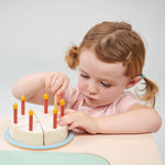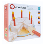 This wooden cake toy set includes a 6-piece, sliceable cake with velcro, 6 pretend candles, a tray and a toy cake slicer.